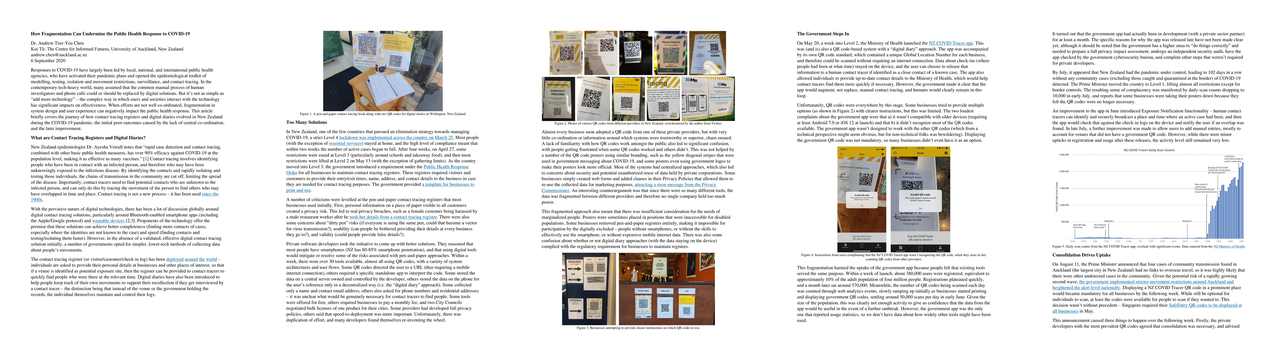 This paper examines how fragmentation in system design and user experience can undermine the public health response to COVID-19, using New Zealand's evolving contact tracing efforts as a case study. Initially, poor outcomes resulted from a lack of central coordination, but improvements followed better integration.