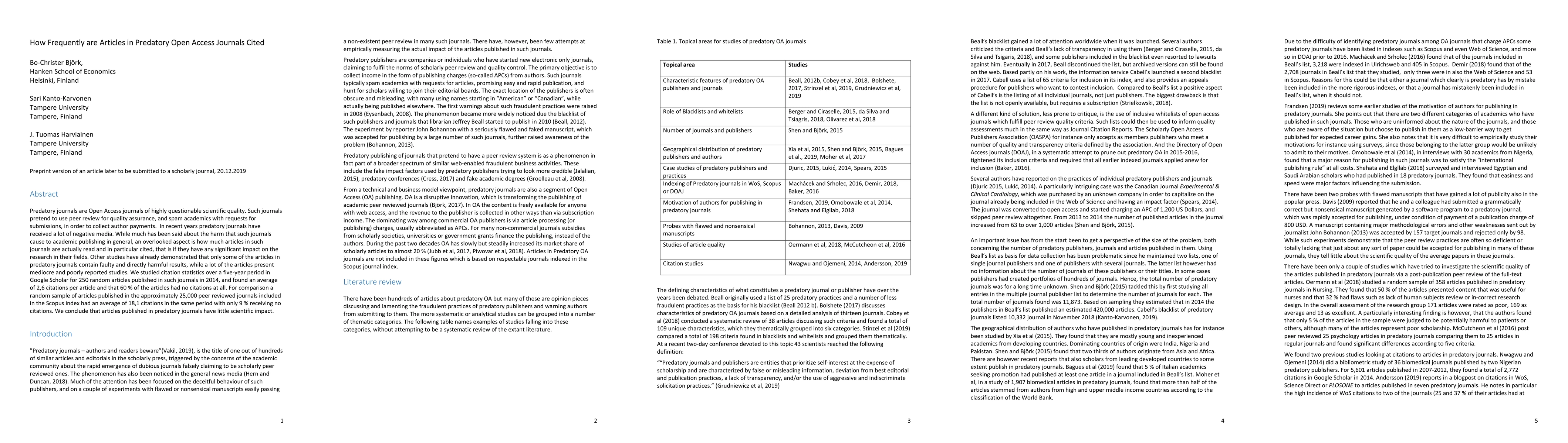 This study investigates the citation frequency of articles in predatory open access journals, finding an average of 2.6 citations per article over five years, with 60% receiving no citations at all. In comparison, articles in peer-reviewed journals indexed in Scopus averaged 18.1 citations, with only 9% uncited, indicating minimal scientific impact from predatory journals.