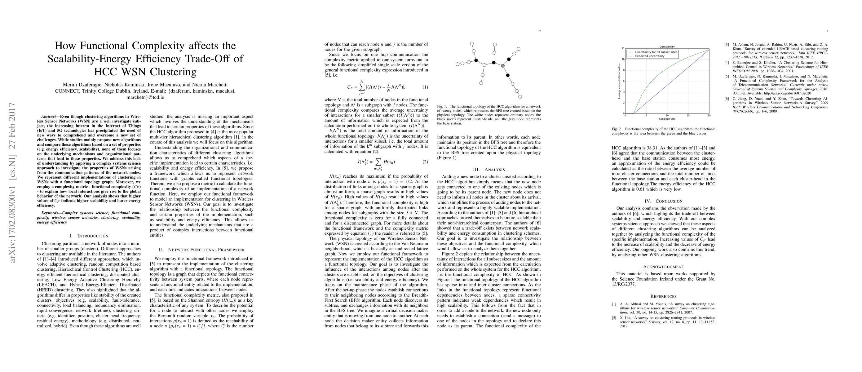 Even though clustering algorithms in Wireless Sensor Networks (WSN) are a well investigate subject, the increasing interest in the Internet of Things (IoT) and 5G technologies has precipitated the need of new ways to comprehend and overcome a new set of challenges. While studies mainly propose new algorithms and compare these algorithms based on a set of properties (e.g. energy efficiency, scalability), none of them focuses on the underlying mechanisms and organizational patterns that lead to these properties. We address this lack of understanding by applying a complex systems science approach to investigate the properties of WSNs arising from the communication patterns of the network nodes. We represent different implementations of clustering in WSNs with a functional topology graph. Moreover, we employ a complexity metric - functional complexity (CF) - to explain how local interactions give rise to the global behavior of the network. Our analysis shows that higher values of CF indicate higher scalability and lower energy efficiency.