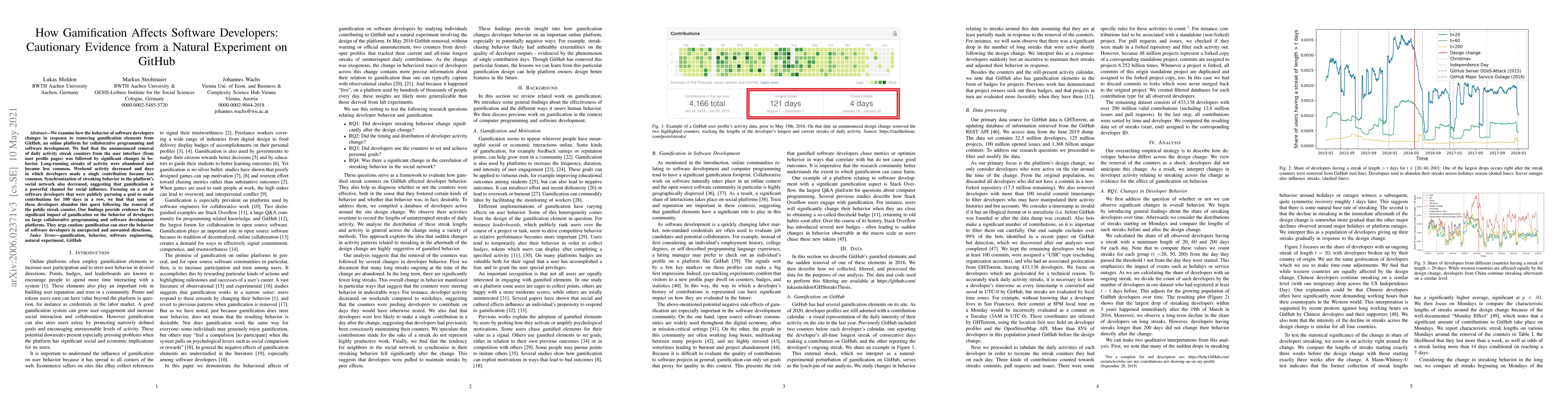 This study investigates the impact of removing gamification elements from GitHub on developer behavior, revealing that the removal of daily activity streak counters led to decreased long-term activity and synchronization, suggesting gamification significantly influences developer motivation and social dynamics. The findings caution against unintended behavioral consequences of gamification in collaborative platforms.