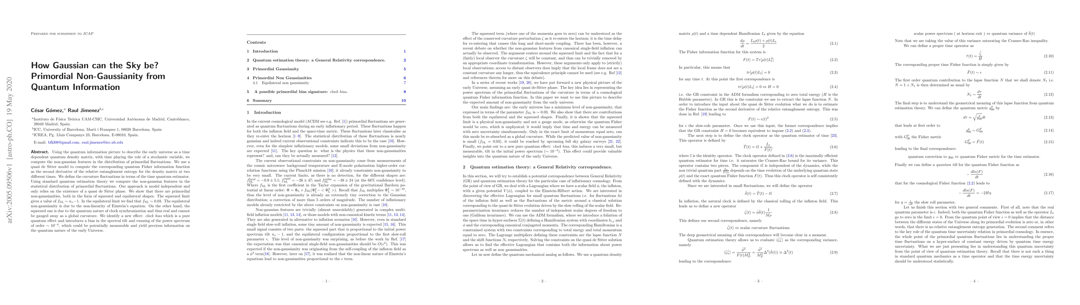 Using the quantum information picture to describe the early universe as a time dependent quantum density matrix, with time playing the role of a stochastic variable, we compute the non-gaussian features in the distribution of primordial fluctuations. We use a quasi de Sitter model to compute the corresponding quantum Fisher information function as the second derivative of the relative entanglement entropy for the density matrix at two different times. We define the curvature fluctuations in terms of the time quantum estimator. Using standard quantum estimation theory we compute the non-gaussian features in the statistical distribution of primordial fluctuations. Our approach is model independent and only relies on the existence of a quasi de Sitter phase. We show that there are primordial non-gaussianities, both in the form of squeezed and equilateral shapes. The squeezed limit gives a value of $f_{\rm NL} \sim n_s-1$. In the equilateral limit we find that $f_{\rm NL} \sim 0.03$. The equilateral non-gaussianity is due to the non-linearity of Einstein's equation. On the other hand, the squeezed one is due to the quantum nature of clock synchronization and thus real and cannot be gauged away as a global curvature. We identify a new effect: {\it clock bias} which is a pure quantum effect and introduces a bias in the spectral tilt and running of the power spectrum of order $\sim 10^{-4}$, which could be potentially measurable and yield precious information on the quantum nature of the early Universe.