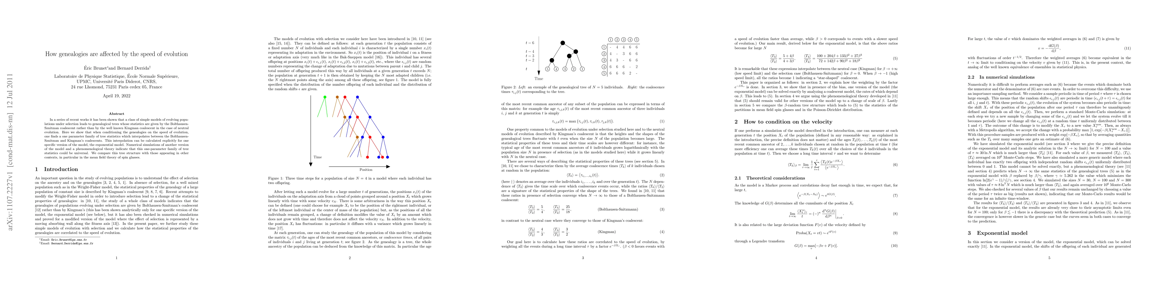 In a series of recent works it has been shown that a class of simple models of evolving populations under selection leads to genealogical trees whose statistics are given by the Bolthausen-Sznitman coalescent rather than by the well known Kingman coalescent in the case of neutral evolution. Here we show that when conditioning the genealogies on the speed of evolution, one finds a one parameter family of tree statistics which interpolates between the Bolthausen-Sznitman and Kingman's coalescents. This interpolation can be calculated explicitly for one specific version of the model, the exponential model. Numerical simulations of another version of the model and a phenomenological theory indicate that this one-parameter family of tree statistics could be universal. We compare this tree structure with those appearing in other contexts, in particular in the mean field theory of spin glasses.