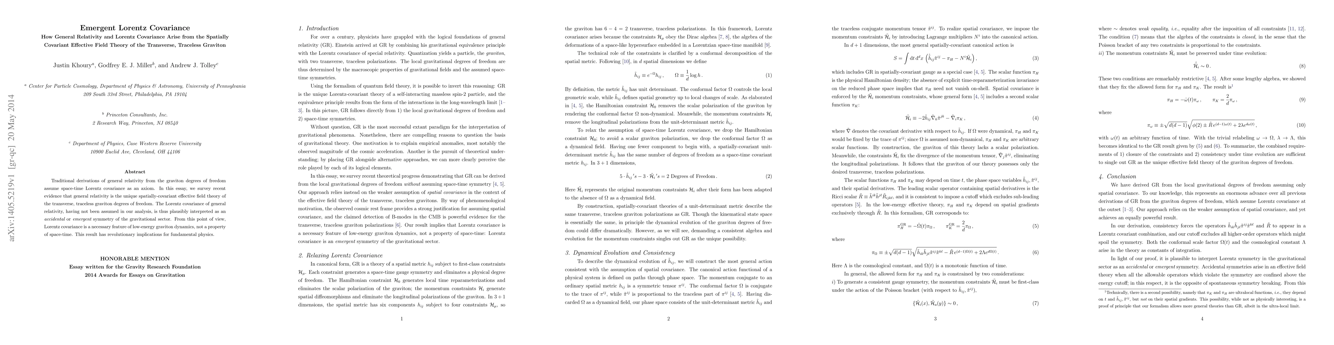 This paper argues that general relativity emerges as the unique spatially-covariant effective field theory of the transverse, traceless graviton, without assuming space-time Lorentz covariance. It suggests that Lorentz covariance is an emergent property of low-energy graviton dynamics rather than a fundamental space-time symmetry.