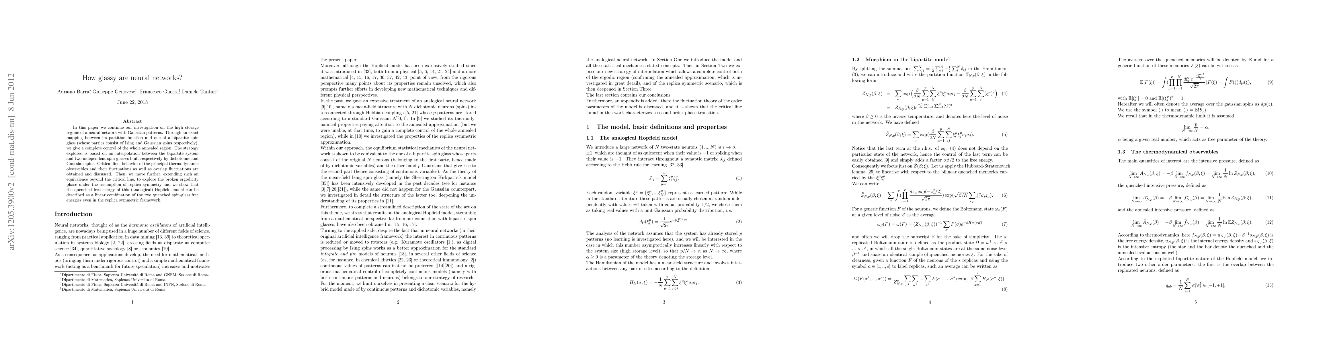 In this paper we continue our investigation on the high storage regime of a neural network with Gaussian patterns. Through an exact mapping between its partition function and one of a bipartite spin glass (whose parties consist of Ising and Gaussian spins respectively), we give a complete control of the whole annealed region. The strategy explored is based on an interpolation between the bipartite system and two independent spin glasses built respectively by dichotomic and Gaussian spins: Critical line, behavior of the principal thermodynamic observables and their fluctuations as well as overlap fluctuations are obtained and discussed. Then, we move further, extending such an equivalence beyond the critical line, to explore the broken ergodicity phase under the assumption of replica symmetry and we show that the quenched free energy of this (analogical) Hopfield model can be described as a linear combination of the two quenched spin-glass free energies even in the replica symmetric framework.