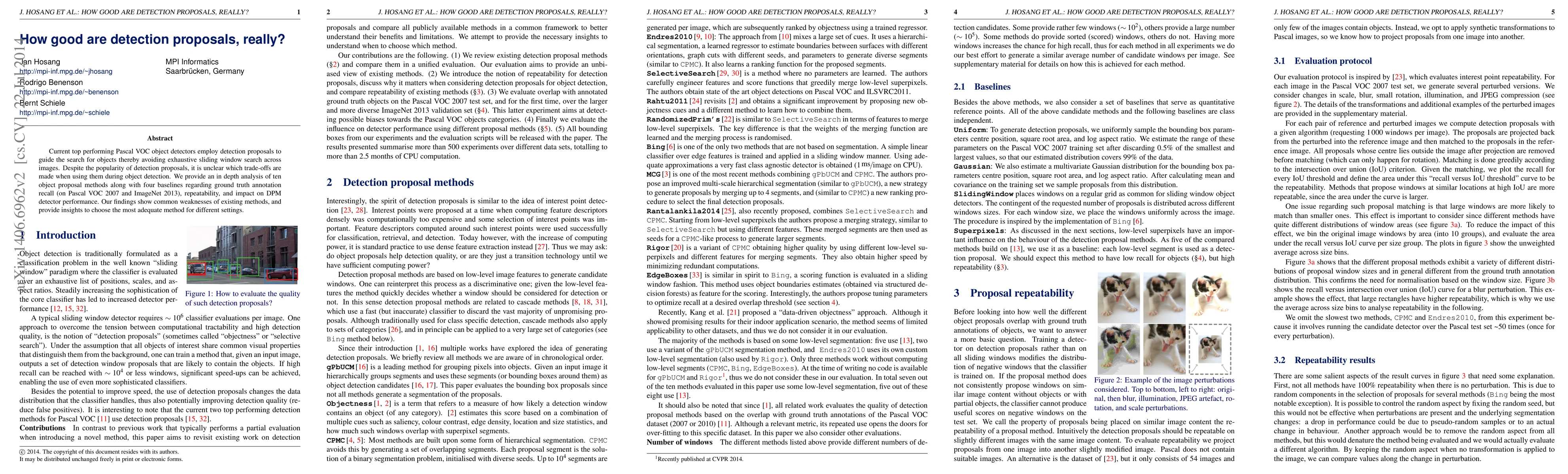 Current top performing Pascal VOC object detectors employ detection proposals to guide the search for objects thereby avoiding exhaustive sliding window search across images. Despite the popularity of detection proposals, it is unclear which trade-offs are made when using them during object detection. We provide an in depth analysis of ten object proposal methods along with four baselines regarding ground truth annotation recall (on Pascal VOC 2007 and ImageNet 2013), repeatability, and impact on DPM detector performance. Our findings show common weaknesses of existing methods, and provide insights to choose the most adequate method for different settings.
