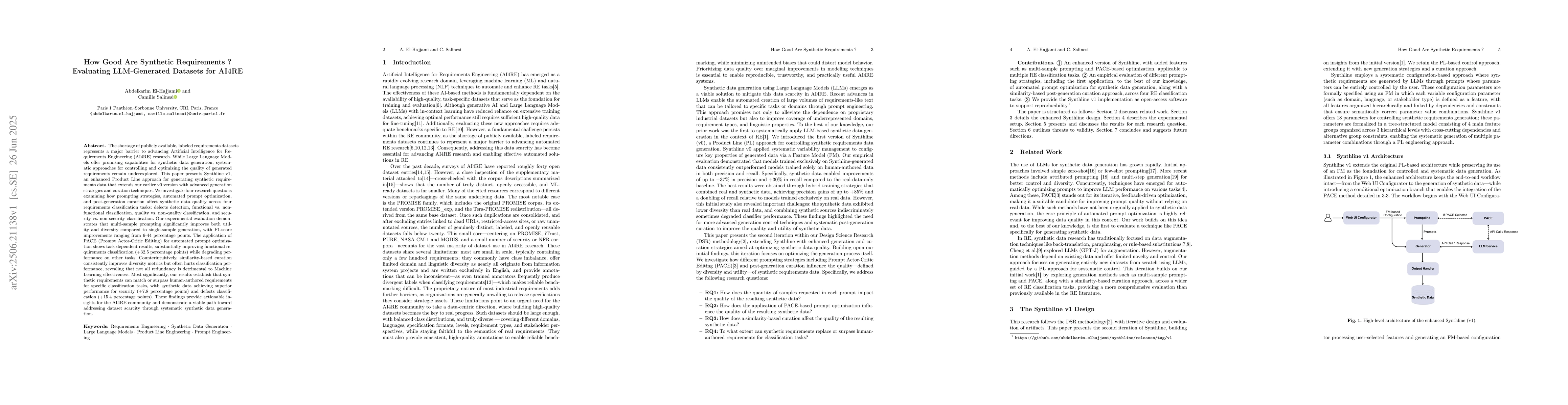 The shortage of publicly available, labeled requirements datasets remains a major barrier to advancing Artificial Intelligence for Requirements Engineering (AI4RE). While Large Language Models offer promising capabilities for synthetic data generation, systematic approaches to control and optimize the quality of generated requirements remain underexplored. This paper presents Synthline v1, an enhanced Product Line approach for generating synthetic requirements data that extends our earlier v0 version with advanced generation strategies and curation techniques. We investigate four research questions assessing how prompting strategies, automated prompt optimization, and post-generation curation affect data quality across four classification tasks: defect detection, functional vs. non-functional, quality vs. non-quality, and security vs. non-security. Our evaluation shows that multi-sample prompting significantly boosts both utility and diversity over single-sample generation, with F1-score gains from 6 to 44 points. The use of PACE (Prompt Actor-Critic Editing) for automated prompt optimization yields task-dependent results, greatly improving functional classification (+32.5 points) but reducing performance on others. Interestingly, similarity-based curation improves diversity but often harms classification performance, indicating that some redundancy may help ML models. Most importantly, our results show that synthetic requirements can match or outperform human-authored ones for specific tasks, with synthetic data surpassing human data for security (+7.8 points) and defect classification (+15.4 points). These findings offer practical insights for AI4RE and chart a viable path to mitigating dataset scarcity through systematic synthetic generation.