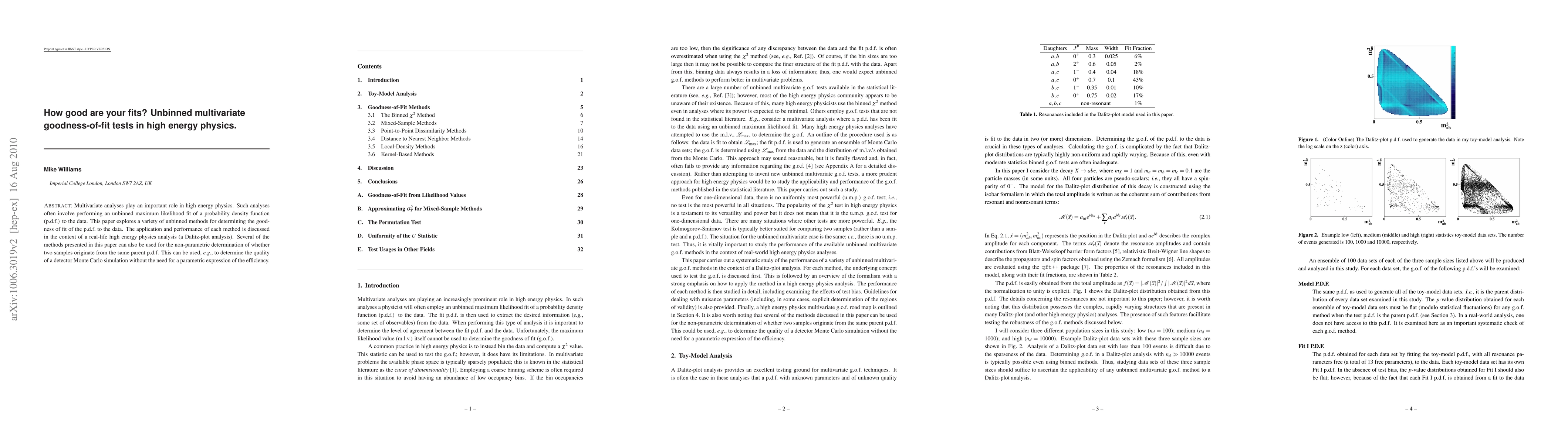 This paper investigates unbinned multivariate goodness-of-fit tests for high energy physics, focusing on the application of various methods to assess the fit of a probability density function to data, using a Dalitz-plot analysis as a case study. It also explores the use of these methods for non-parametric comparison of data distributions, aiding in detector simulation quality assessment without requiring a parametric model.