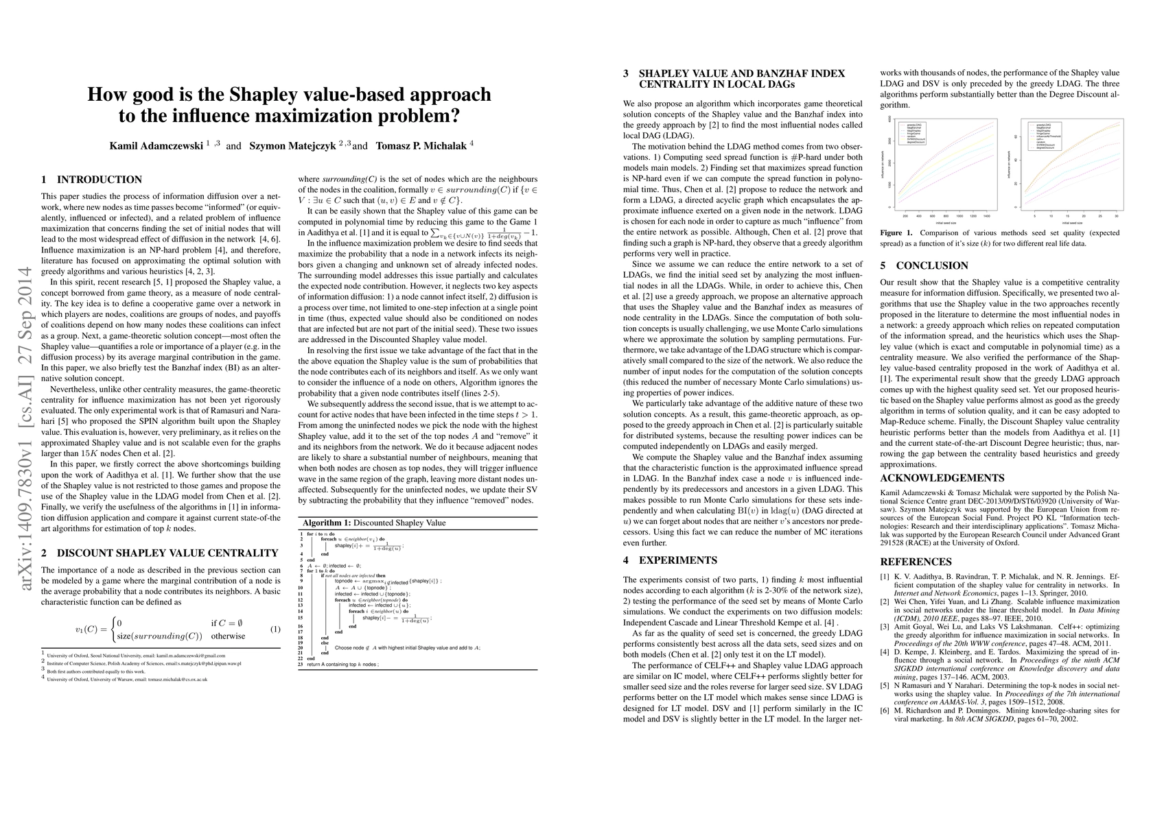 The Shapley value has been recently advocated as a method to choose the seed nodes for the process of information diffusion. Intuitively, since the Shapley value evaluates the average marginal contribution of a player to the coalitional game, it can be used in the network context to evaluate the marginal contribution of a node in the process of information diffusion given various groups of already 'infected' nodes. Although the above direction of research seems promising, the current liter- ature is missing a throughout assessment of its performance. The aim of this work is to provide such an assessment of the existing Shapley value-based approaches to information diffusion.
