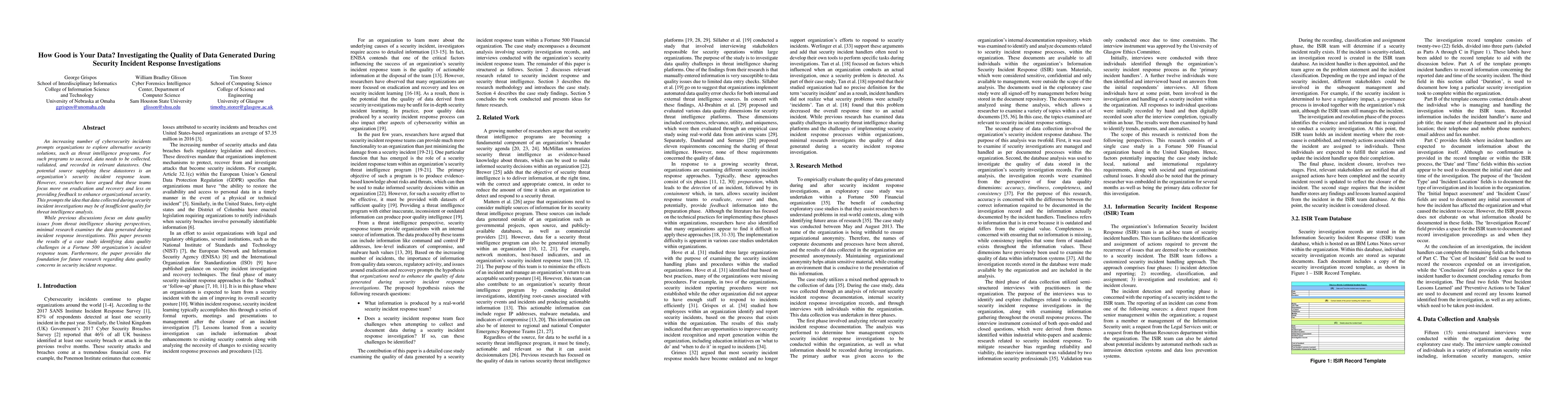 This paper investigates the quality of data generated during security incident response investigations in a Fortune 500 organization, highlighting challenges in data collection and validation. It lays the groundwork for future research on improving data quality for threat intelligence programs.