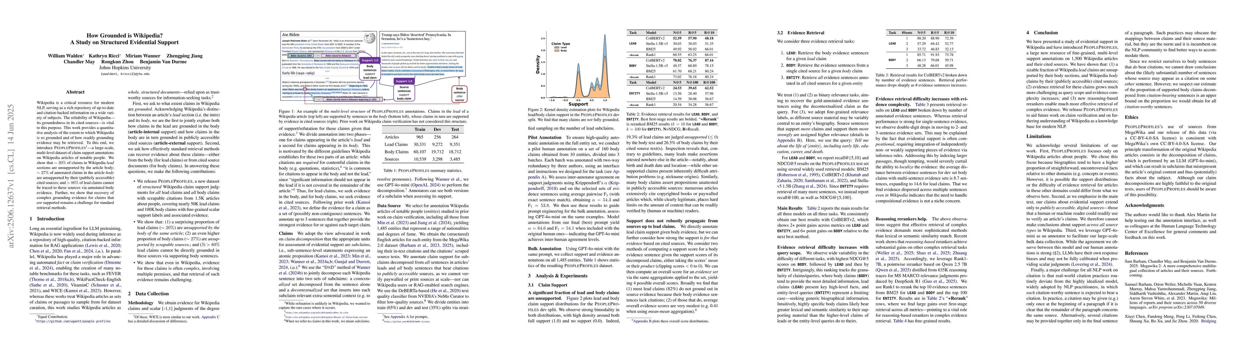 The paper presents PeopleProfiles, a dataset of claim support annotations, and demonstrates its use in evaluating the groundedness of Wikipedia.