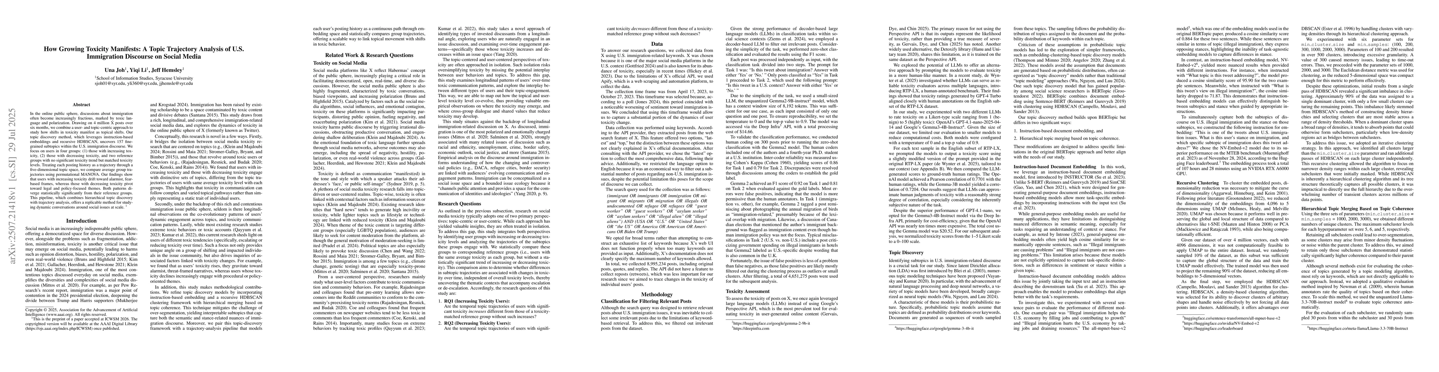 In the online public sphere, discussions about immigration often become increasingly fractious, marked by toxic language and polarization. Drawing on 4 million X posts over six months, we combine a user- and topic-centric approach to study how shifts in toxicity manifest as topical shifts. Our topic discovery method, which leverages instruction-based embeddings and recursive HDBSCAN, uncovers 157 fine-grained subtopics within the U.S. immigration discourse. We focus on users in four groups: (1) those with increasing toxicity, (2) those with decreasing toxicity, and two reference groups with no significant toxicity trend but matched toxicity levels. Treating each posting history as a trajectory through a five-dimensional topic space, we compare average group trajectories using permutational MANOVA. Our findings show that users with increasing toxicity drift toward alarmist, fear-based frames, whereas those with decreasing toxicity pivot toward legal and policy-focused themes. Both patterns diverge statistically significantly from their reference groups. This pipeline, which combines hierarchical topic discovery with trajectory analysis, offers a replicable method for studying dynamic conversations around social issues at scale.