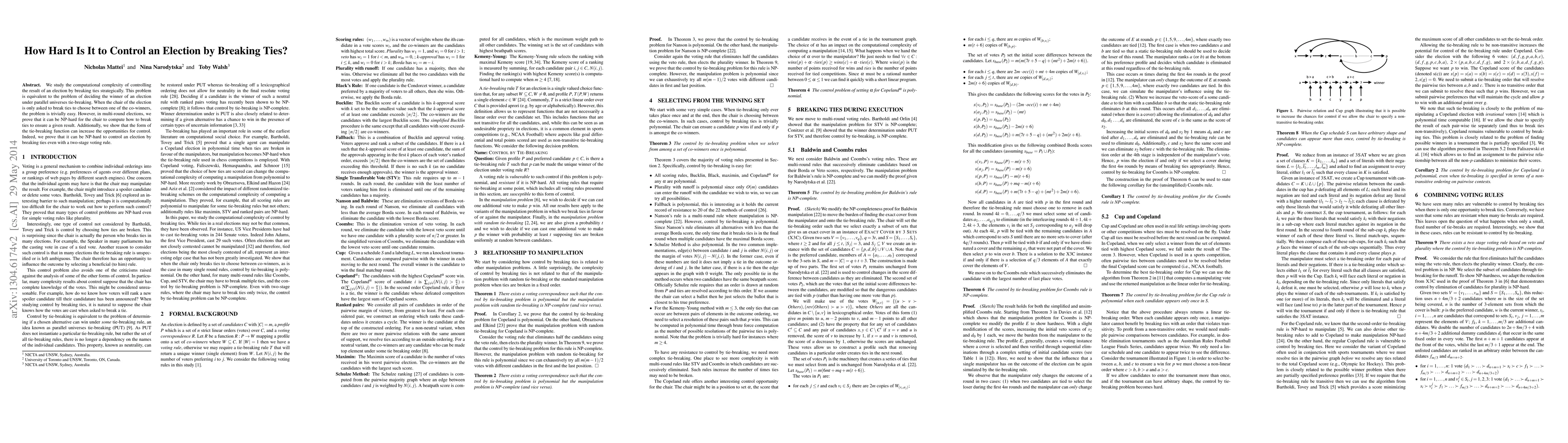This paper investigates the computational difficulty of manipulating election outcomes by strategically breaking ties. It shows that while single-round tie-breaking is straightforward, multi-round elections can be NP-hard to control, and different tie-breaking rules can further complicate the manipulation process.