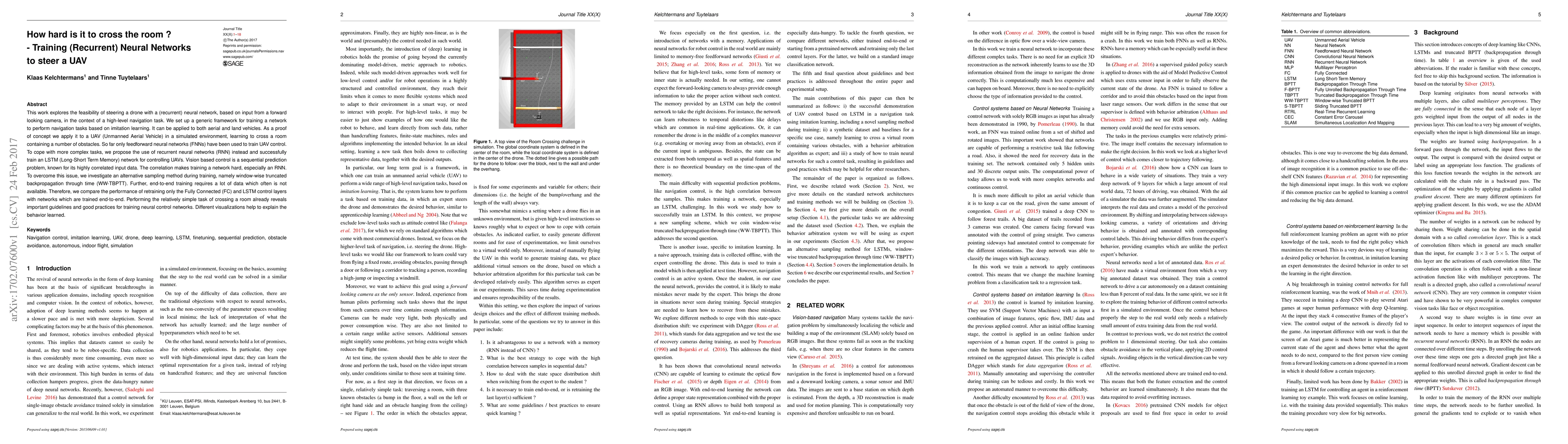 This work explores the feasibility of steering a drone with a (recurrent) neural network, based on input from a forward looking camera, in the context of a high-level navigation task. We set up a generic framework for training a network to perform navigation tasks based on imitation learning. It can be applied to both aerial and land vehicles. As a proof of concept we apply it to a UAV (Unmanned Aerial Vehicle) in a simulated environment, learning to cross a room containing a number of obstacles. So far only feedforward neural networks (FNNs) have been used to train UAV control. To cope with more complex tasks, we propose the use of recurrent neural networks (RNN) instead and successfully train an LSTM (Long-Short Term Memory) network for controlling UAVs. Vision based control is a sequential prediction problem, known for its highly correlated input data. The correlation makes training a network hard, especially an RNN. To overcome this issue, we investigate an alternative sampling method during training, namely window-wise truncated backpropagation through time (WW-TBPTT). Further, end-to-end training requires a lot of data which often is not available. Therefore, we compare the performance of retraining only the Fully Connected (FC) and LSTM control layers with networks which are trained end-to-end. Performing the relatively simple task of crossing a room already reveals important guidelines and good practices for training neural control networks. Different visualizations help to explain the behavior learned.