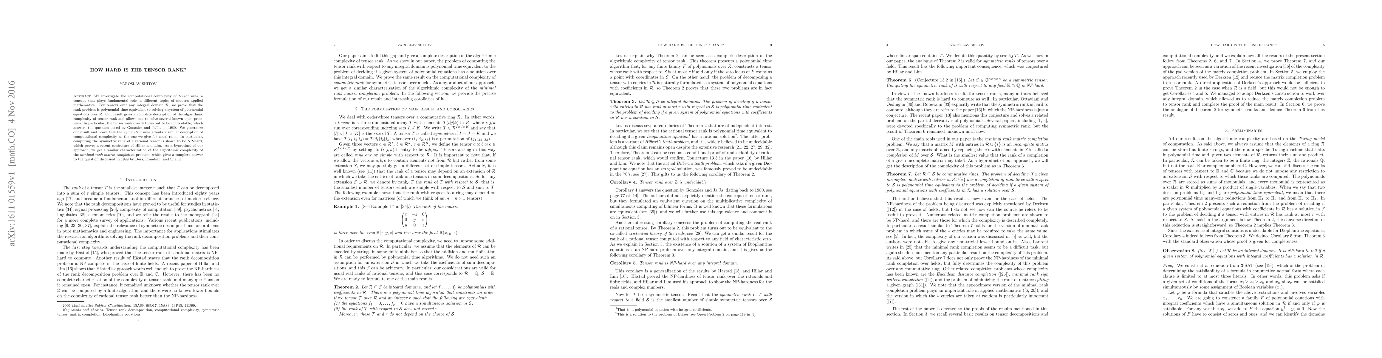 The research paper shows that tensor rank is polynomial time equivalent to solving a system of polynomial equations, answering several open problems and providing new insights into the computational complexity of tensor rank and minimal rank matrix completion.