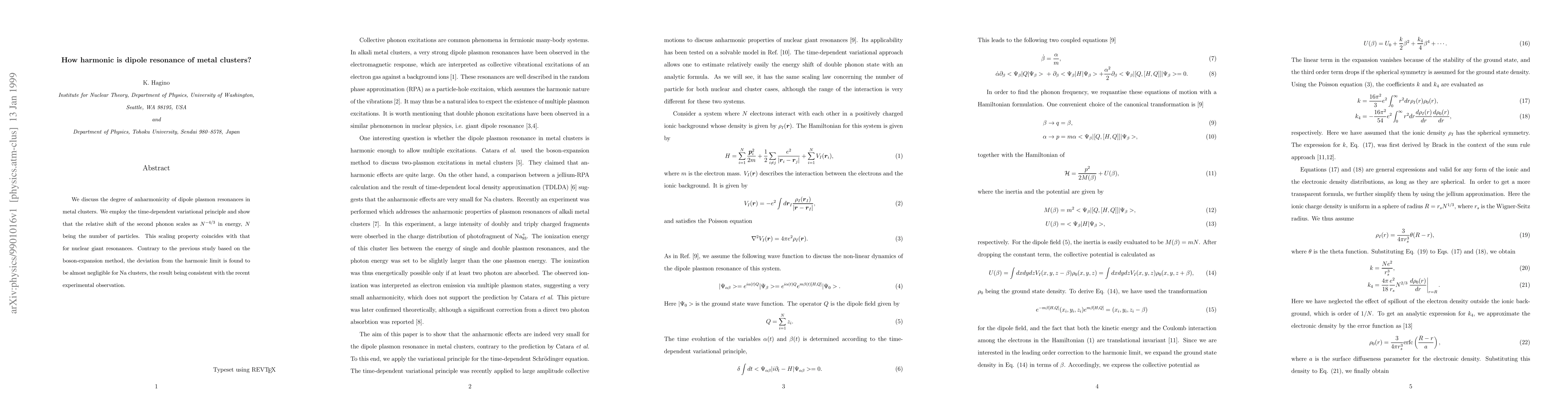 Researchers found that the anharmonicity of dipole plasmon resonances in metal clusters is surprisingly small, scaling at $N^{-4/3}$, similar to nuclear giant resonances.