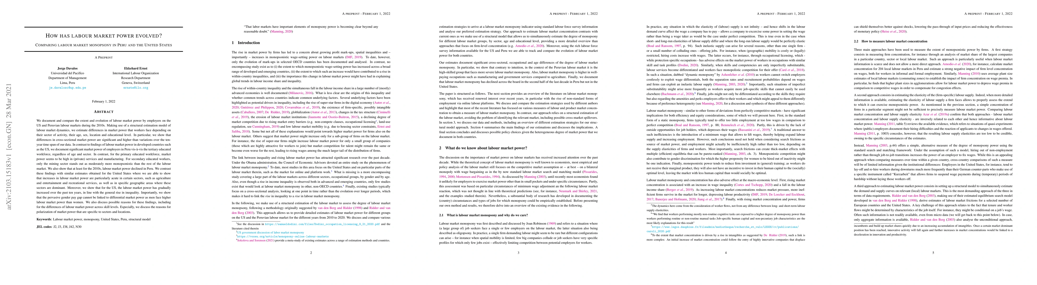 We document the evolution of labour market power by employers on the US and Peruvian labour markets during the 2010s. Making use of a structural estimation model of labour market dynamics, we estimate differences in market power that workers face depending on their sector of activity, their age, sex, location and educational level. In particular, we show that differences in cross-sectional market power are significant and higher than variations over the ten-year time span of our data. In contrast to findings of labour market power in developed countries such as the US, we document significant market power of employers in Peru vis-\`a-vis the tertiary educated workforce, regardless of age and sector. In contrast, for the primary educated workforce, market power seems to be high in (private) services and manufacturing. For secondary educated workers, only the mining sector stands out as moderately more monopsonistic than the rest of the labour market. We also show that at least for the 2010s, labour market power declined in Peru. We contrast these findings with similar estimates obtained for the United States where we are able to show that increases in labour market power are particularly acute in certain sectors, such as agriculture and entertainment and recreational services, as well as in specific geographic areas where these sectors are dominant. Moreover, we show that for the US, the labour market power has gradually increased over the past ten years, in line with the general rise in inequality. Importantly, we show that the pervasive gender pay gap cannot be linked to differential market power as men face higher labour market power than women. We also discuss possible reasons for these findings, including for the differences of labour market power across skill levels. Especially, we discuss the reasons for polarization of market power that are specific to sectors and locations.