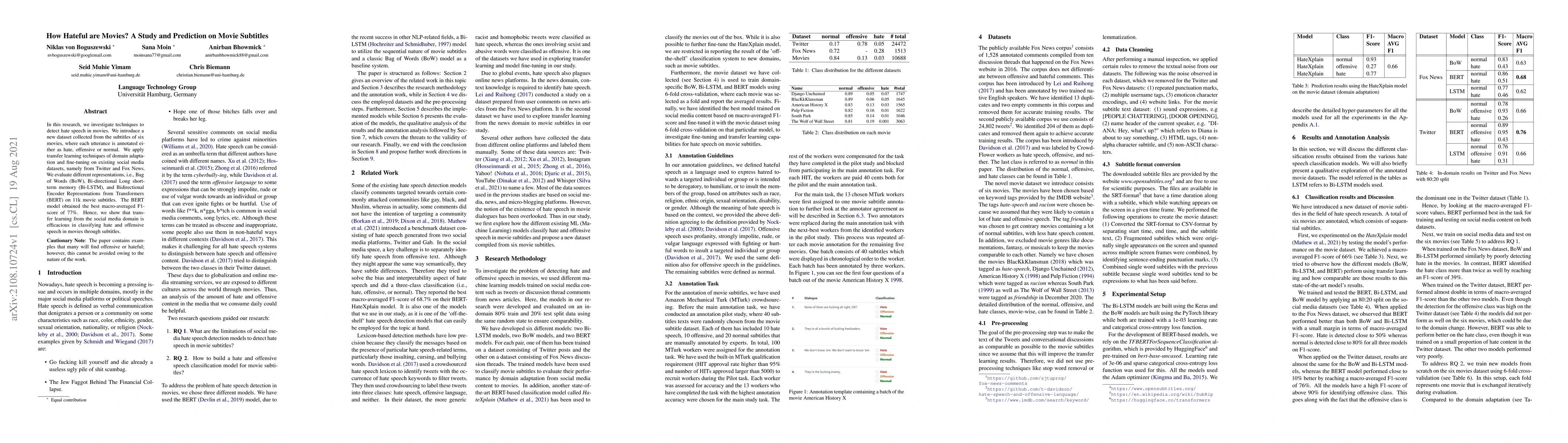 In this research, we investigate techniques to detect hate speech in movies. We introduce a new dataset collected from the subtitles of six movies, where each utterance is annotated either as hate, offensive or normal. We apply transfer learning techniques of domain adaptation and fine-tuning on existing social media datasets, namely from Twitter and Fox News. We evaluate different representations, i.e., Bag of Words (BoW), Bi-directional Long short-term memory (Bi-LSTM), and Bidirectional Encoder Representations from Transformers (BERT) on 11k movie subtitles. The BERT model obtained the best macro-averaged F1-score of 77%. Hence, we show that transfer learning from the social media domain is efficacious in classifying hate and offensive speech in movies through subtitles.