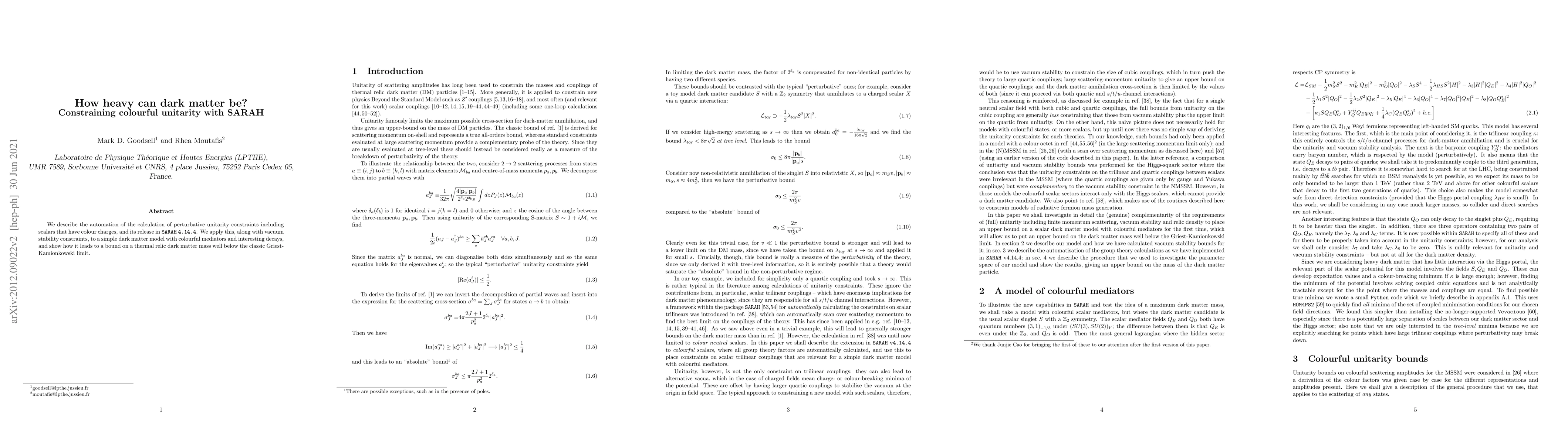 We describe the automation of the calculation of perturbative unitarity constraints including scalars that have colour charges, and its release in SARAH 4.14.4. We apply this, along with vacuum stability constraints, to a simple dark matter model with colourful mediators and interesting decays, and show how it leads to a bound on a thermal relic dark matter mass well below the classic Griest-Kamionkowski limit.