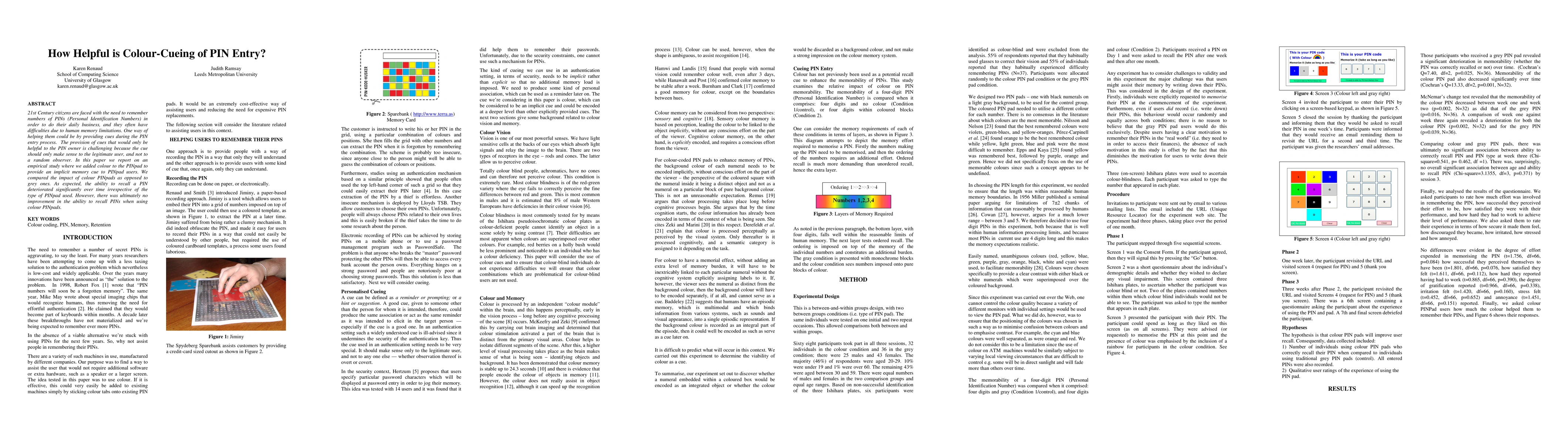 This study investigates the effectiveness of colour-cueing on PIN entry devices to aid memory retention but finds no significant improvement in recall when using coloured PINpads compared to grey ones, despite the challenge of providing cues that are only helpful to the legitimate user.