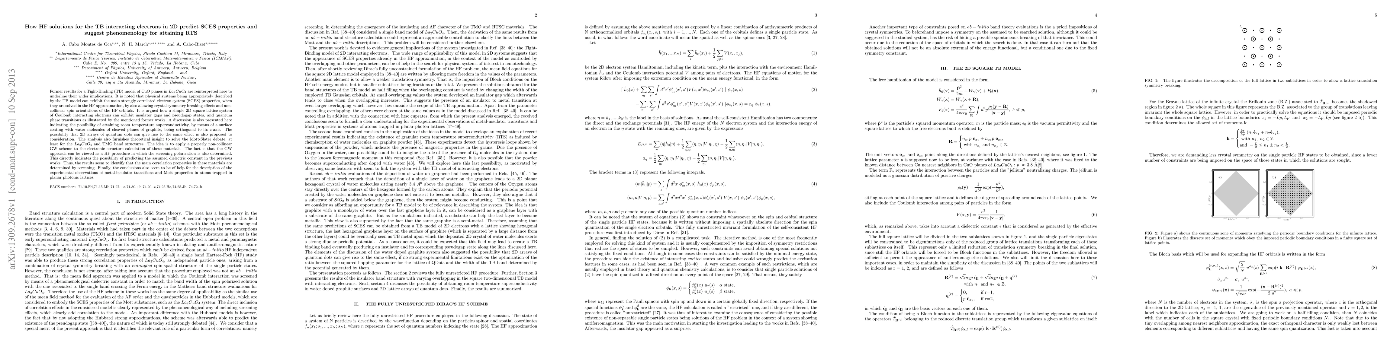 Former results for a Tight-Binding (TB) model of CuO planes in La2CuO4 are reinterpreted here to underline their wider implications. It is noted that physical systems being appropriately described by the TB model can exhibit the main strongly correlated electron system (SCES) properties, when they are solved in the HF approximation, by also allowing crystal symmetry breaking effects and non-collinear spin orientations of the HF orbitals. It is argued how a simple 2D square lattice system of Coulomb interacting electrons can exhibit insulator gaps and pseudogap states, and quantum phase transitions as illustrated by the mentioned former works. A discussion is also presented here indicating the possibility of attaining room temperature superconductivity, by means of a surface coating with water molecules of cleaved planes of graphite, being orthogonal to its c-axis. The possibility that 2D arrays of quantum dots can give rise to the same effect is also proposed to consideration. The analysis also furnishes theoretical insight to solve the Mott-Slater debate, at least for the La2CuO4 and TMO band structures. The idea is to apply a properly non-collinear GW scheme to the electronic structure calculation of these materials. The fact is that the GW approach can be viewed as a HF procedure in which the screening polarization is also determined. This directly indicates the possibility of predicting the assumed dielectric constant in the previous works. Thus, the results seem to identify that the main correlation properties in these materials are determined by screening. Finally, the conclusions also seem to be of help for the description of the experimental observations of metal-insulator transitions and Mott properties in atoms trapped in planar photonic lattices.