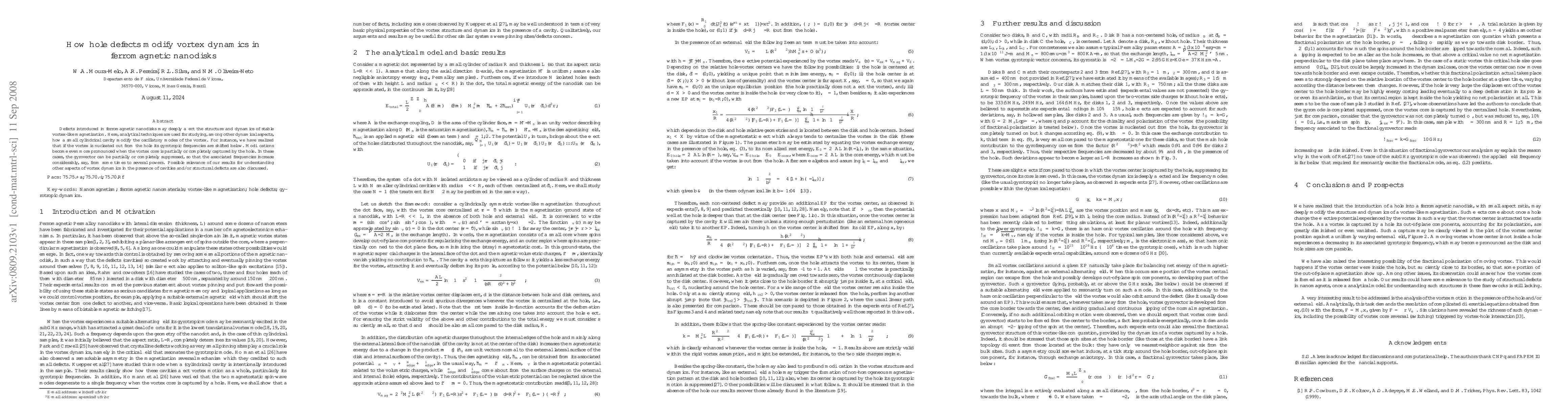 Defects introduced in ferromagnetic nanodisks may deeply affect the structure and dynamics of stable vortex-like magnetization. Here, analytical techniques are used for studying, among other dynamical aspects, how a small cylindrical cavity modify the oscillatory modes of the vortex. For instance, we have realized that if the vortex is nucleated out from the hole its gyrotropic frequencies are shifted below. Modifications become even more pronounced when the vortex core is partially or completely captured by the hole. In these cases, the gyrovector can be partially or completely suppressed, so that the associated frequencies increase considerably, say, from some times to several powers. Possible relevance of our results for understanding other aspects of vortex dynamics in the presence of cavities and/or structural defects are also discussed.