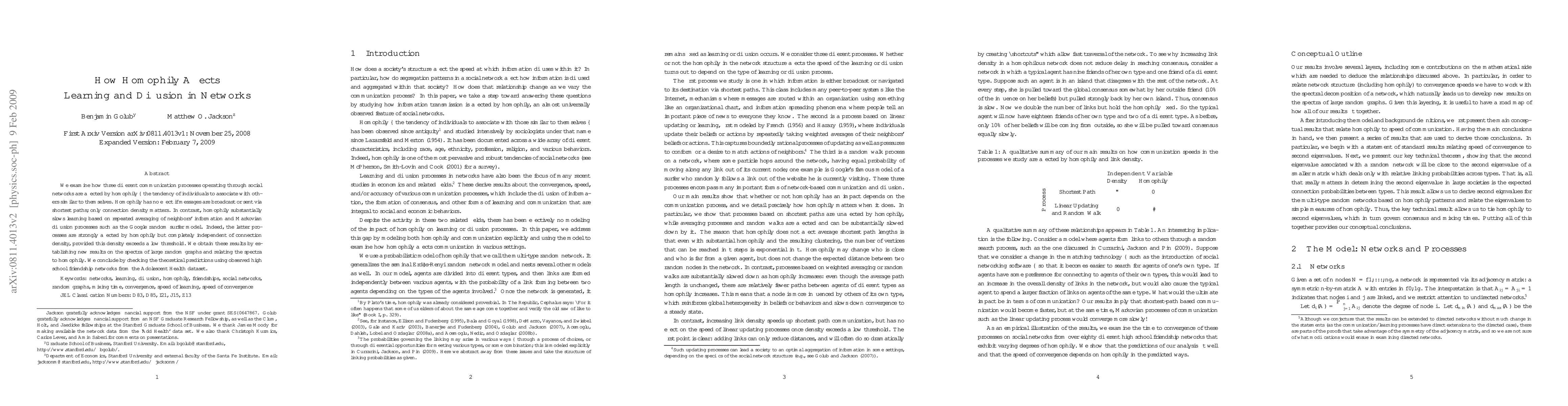 We examine how three different communication processes operating through social networks are affected by homophily -- the tendency of individuals to associate with others similar to themselves. Homophily has no effect if messages are broadcast or sent via shortest paths; only connection density matters. In contrast, homophily substantially slows learning based on repeated averaging of neighbors' information and Markovian diffusion processes such as the Google random surfer model. Indeed, the latter processes are strongly affected by homophily but completely independent of connection density, provided this density exceeds a low threshold. We obtain these results by establishing new results on the spectra of large random graphs and relating the spectra to homophily. We conclude by checking the theoretical predictions using observed high school friendship networks from the Adolescent Health dataset.