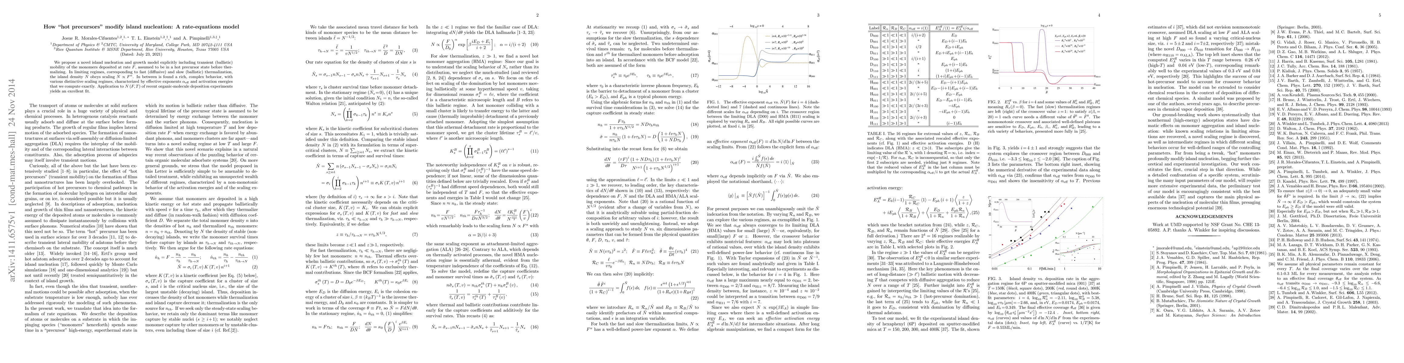 We propose a novel island nucleation and growth model explicitly including transient (ballistic) mobility of the monomers deposited at rate $F$, assumed to be in a hot precursor state before thermalizing. In limiting regimes, corresponding to fast (diffusive) and slow (ballistic) thermalization, the island density $N$ obeys scaling $N \propto F^\alpha$. In between is found a rich, complex behavior, with various distinctive scaling regimes, characterized by effective exponents $\alpha_{\rm eff}$ and activation energies that we compute exactly. Application to $N(F,T)$ of recent organic-molecule deposition experiments yields an excellent fit.
