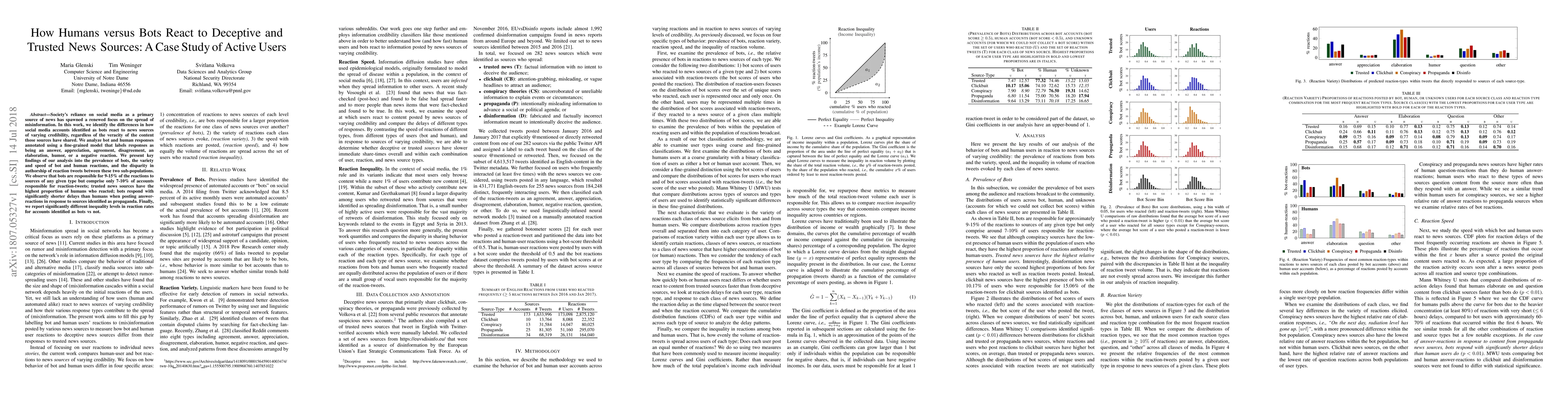 This research investigates how social media bots and human users differ in their reactions to news sources of varying credibility, finding that bots make up 9-15% of reactions but only 7-10% of reaction-tweet authors, with bots responding to propaganda sources more quickly than humans. Trusted news sources elicit the highest proportion of human reactions.