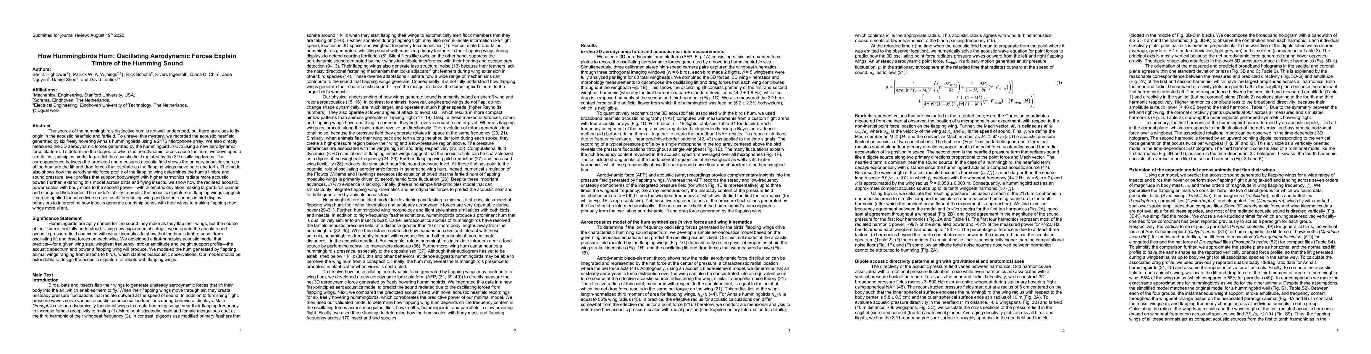 The source of the hummingbirds distinctive hum is not well understood, but there are clues to its origin in the acoustic nearfield and farfield. To unravel this mystery, we recorded the acoustic nearfield generated by six freely hovering Annas hummingbirds using a 2176 microphone array. We also directly measured the 3D aerodynamic forces generated by the hummingbird in vivo using a new aerodynamic force platform. To determine the degree to which the aerodynamic forces cause the hum, we developed a simple first-principles model to predict the acoustic field radiated by the 3D oscillating forces. The correspondence between the predicted and measured acoustic field shows the primary acoustic sources of the hum are the lift and drag forces that oscillate as the flapping wings move back and forth. The model also shows how the aerodynamic force profile of the flapping wing determines the hums timbre and sound pressure level: profiles that support bodyweight with higher harmonics radiate more acoustic power. Further, extending this model across birds and flying insects, we show how the radiated acoustic power scales with body mass to the second power - with allometric deviation making larger birds quieter and elongated flies louder. The model's ability to predict the acoustic signature of flapping wings suggests it can be applied for such diverse uses as differentiating wing and feather sounds in bird display behaviors to interpreting how insects generate courtship songs with their wings to making flapping robot wings more silent.