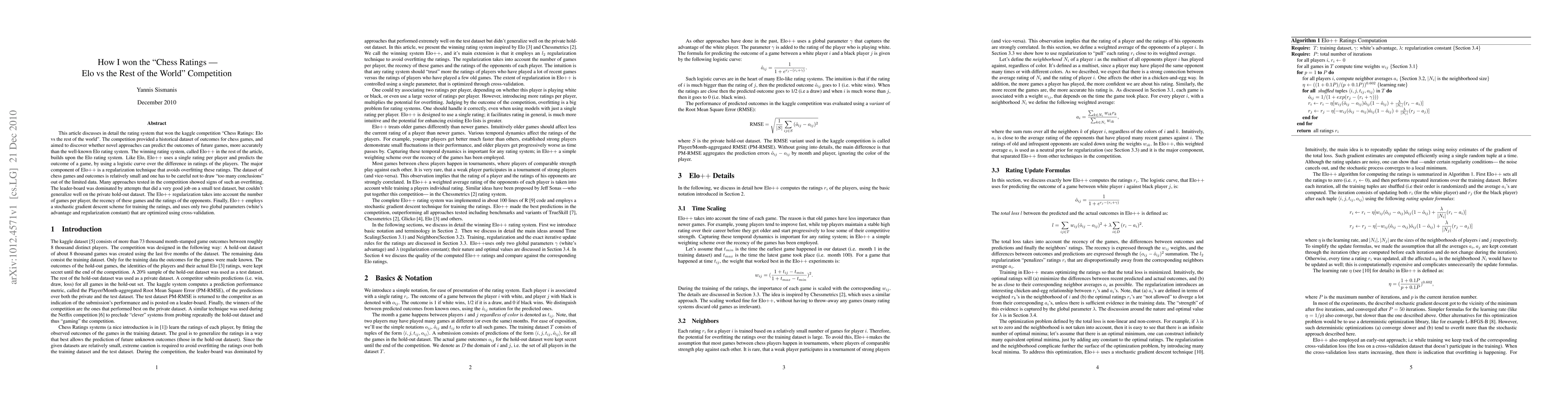 This paper details a winning approach, Elo++, for predicting chess game outcomes in a Kaggle competition, which outperformed the traditional Elo rating system by incorporating regularization to prevent overfitting and leveraging a stochastic gradient descent scheme. The system's success highlights the importance of generalization over fitting to limited datasets.