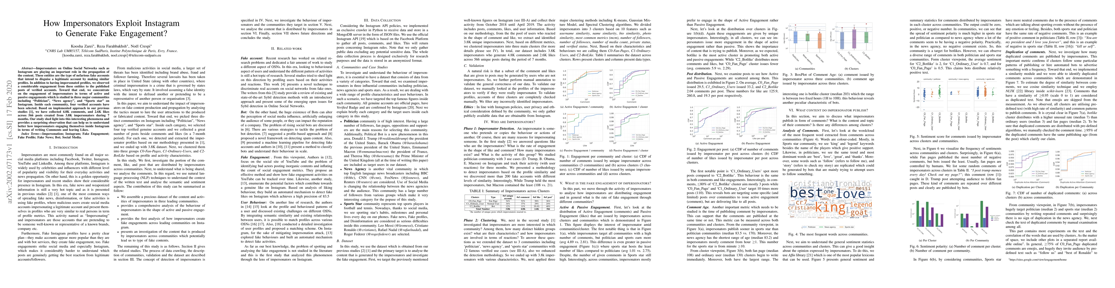 This paper investigates how impersonators on Instagram generate fake engagement by creating profiles that mimic verified accounts, focusing on three communities: Politician, News agency, and Sports star. The study collected 4.8K comments and 2.6K likes from 3.8K impersonators over 7 months, revealing significant engagement tactics used by these fake accounts.