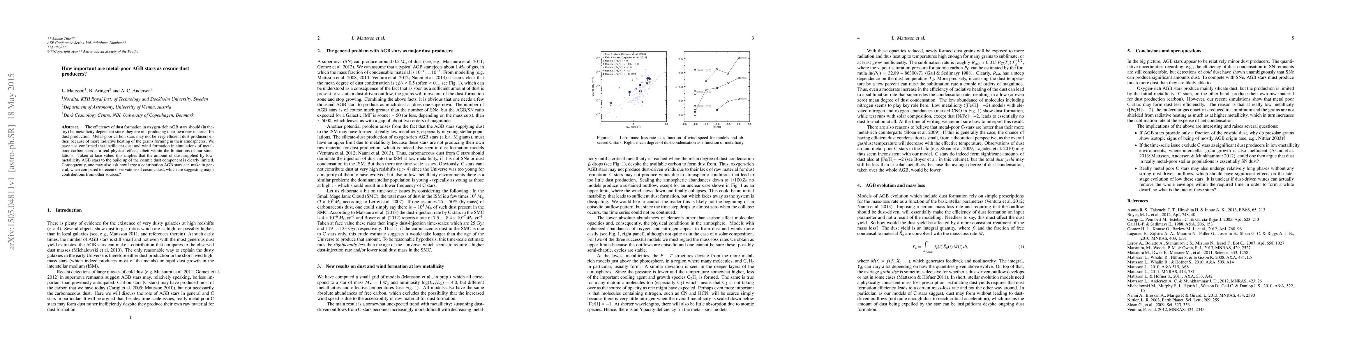 The efficiency of dust formation in oxygen-rich AGB stars should (in theory) be metallicity dependent since they are not producing their own raw material for dust production. Metal-poor carbon stars may not be very efficient dust producers either, because of more radiative heating of the grains forming in their atmospheres. We have just confirmed that inefficient dust and wind formation in simulations of metal-poor carbon stars is a real physical effect, albeit within the limitations of our simulations. Taken at face value, this implies that the amount of dust supplied by low-metallicity AGB stars to the build up of the cosmic dust component is clearly limited. Consequently, one may also ask how large a contribution AGB stars can make in general, when compared to recent observations of cosmic dust, which are suggesting major contributions from other sources?