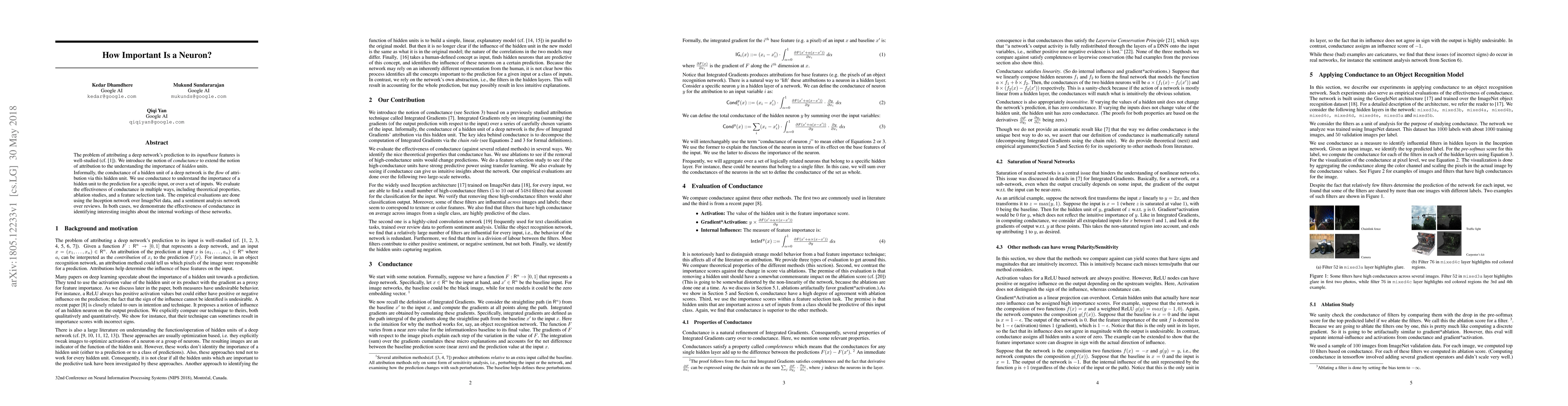 The problem of attributing a deep network's prediction to its \emph{input/base} features is well-studied. We introduce the notion of \emph{conductance} to extend the notion of attribution to the understanding the importance of \emph{hidden} units. Informally, the conductance of a hidden unit of a deep network is the \emph{flow} of attribution via this hidden unit. We use conductance to understand the importance of a hidden unit to the prediction for a specific input, or over a set of inputs. We evaluate the effectiveness of conductance in multiple ways, including theoretical properties, ablation studies, and a feature selection task. The empirical evaluations are done using the Inception network over ImageNet data, and a sentiment analysis network over reviews. In both cases, we demonstrate the effectiveness of conductance in identifying interesting insights about the internal workings of these networks.