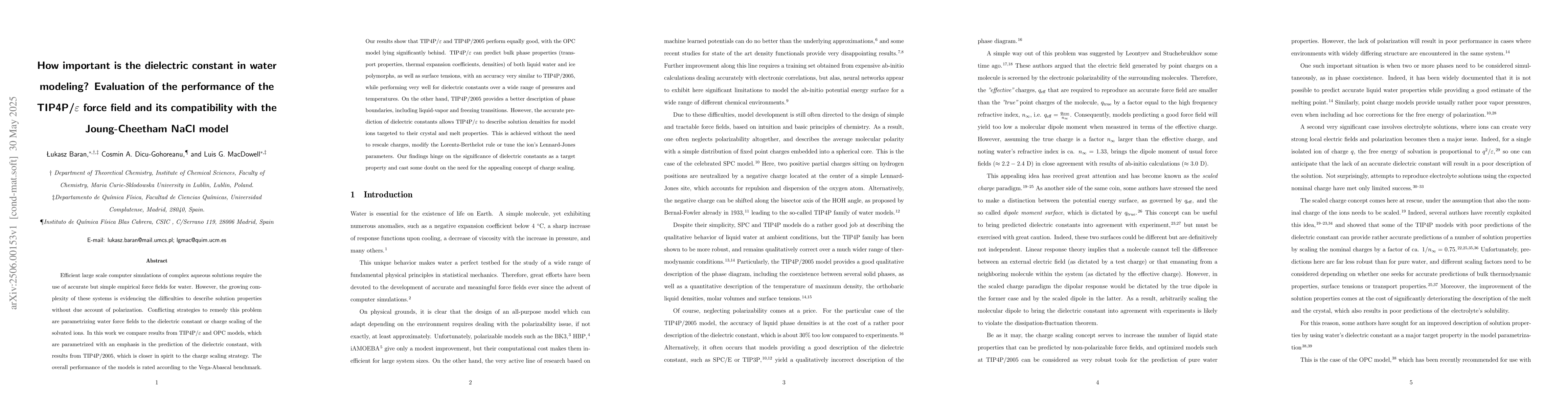 The paper presents a comparative analysis of TIP4P/$\varepsilon$, OPC, and TIP4P/2005 water models, demonstrating the effectiveness of TIP4P/$\varepsilon$ in predicting dielectric constants without charge rescaling.
