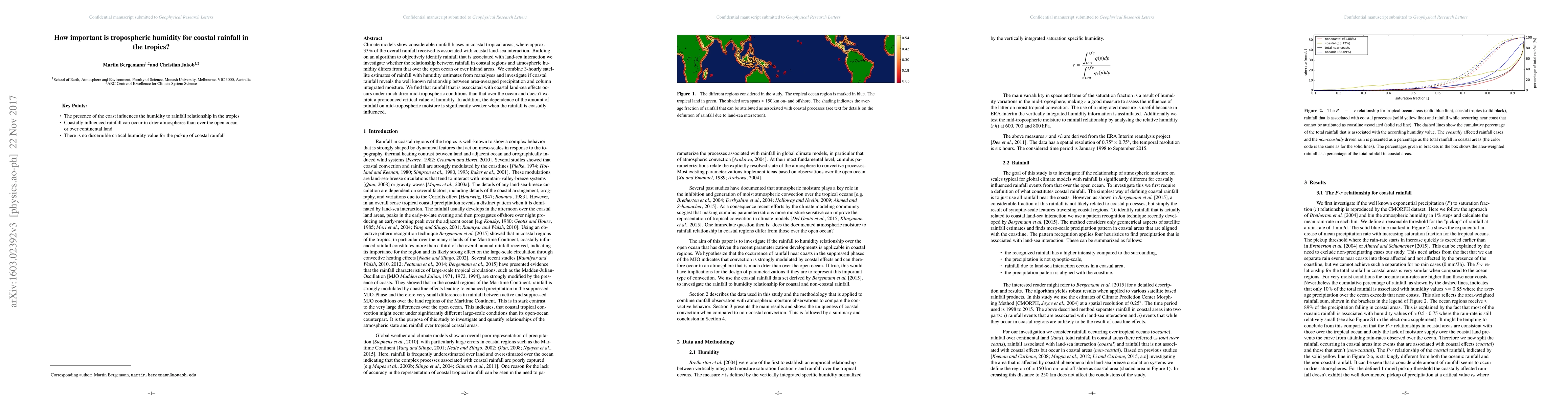 This study investigates the relationship between tropospheric humidity and coastal rainfall in tropical regions, revealing that coastal rainfall occurs under drier mid-tropospheric conditions and shows a weaker dependence on moisture compared to oceanic rainfall, suggesting a need for region-specific convection models.