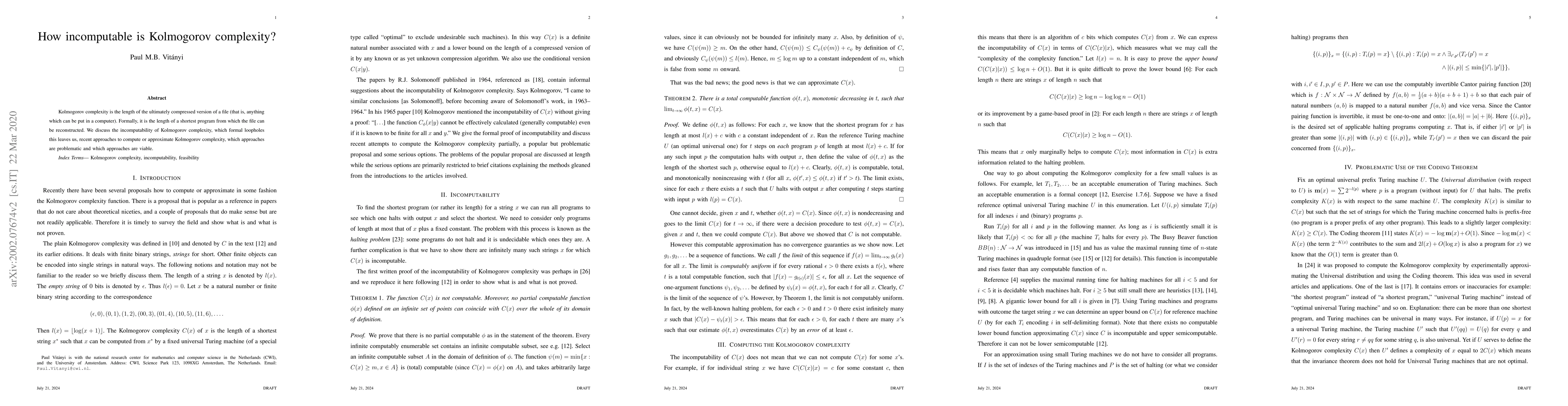 The paper discusses the incomputability of Kolmogorov complexity, exploring formal loopholes, recent approaches to compute or approximate it, and identifying which methods are problematic or viable.