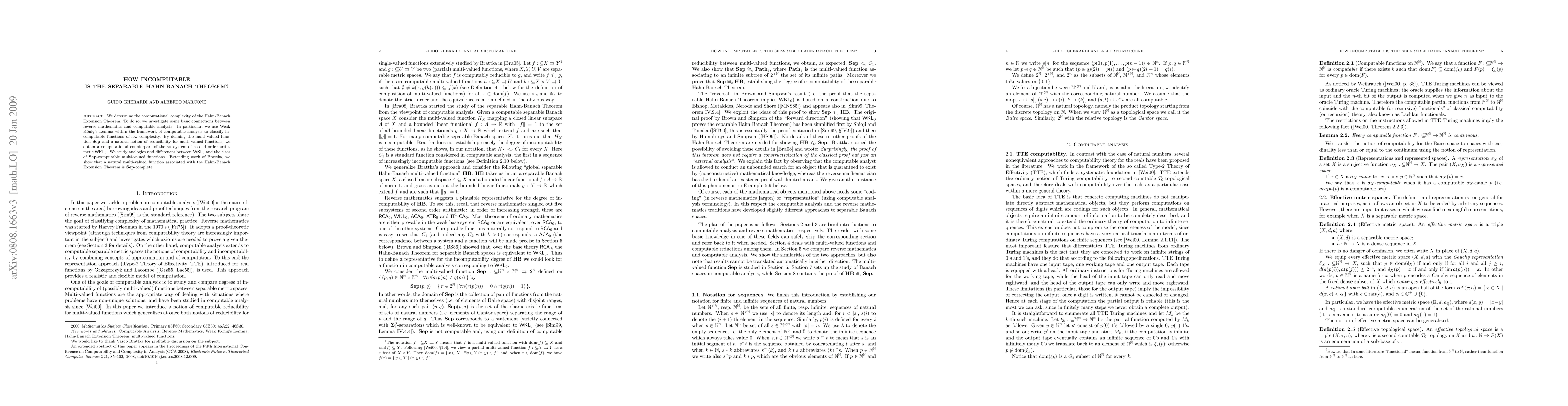 We determine the computational complexity of the Hahn-Banach Extension Theorem. To do so, we investigate some basic connections between reverse mathematics and computable analysis. In particular, we use Weak Konig's Lemma within the framework of computable analysis to classify incomputable functions of low complexity. By defining the multi-valued function Sep and a natural notion of reducibility for multi-valued functions, we obtain a computational counterpart of the subsystem of second order arithmetic WKL_0. We study analogies and differences between WKL_0 and the class of Sep-computable multi-valued functions. Extending work of Brattka, we show that a natural multi-valued function associated with the Hahn-Banach Extension Theorem is Sep-complete.
