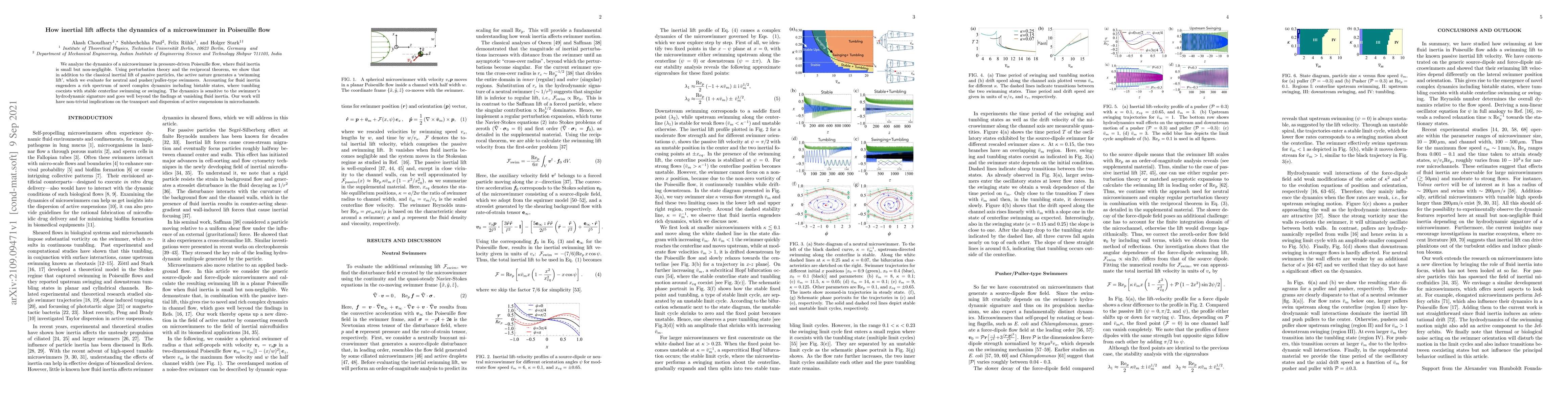 This paper investigates the dynamics of microswimmers in Poiseuille flow, revealing that fluid inertia induces both classical inertial lift and a unique "swimming lift" due to the swimmer's active nature. The study uncovers complex dynamics including bistable states and highlights the importance of the swimmer's hydrodynamic signature.