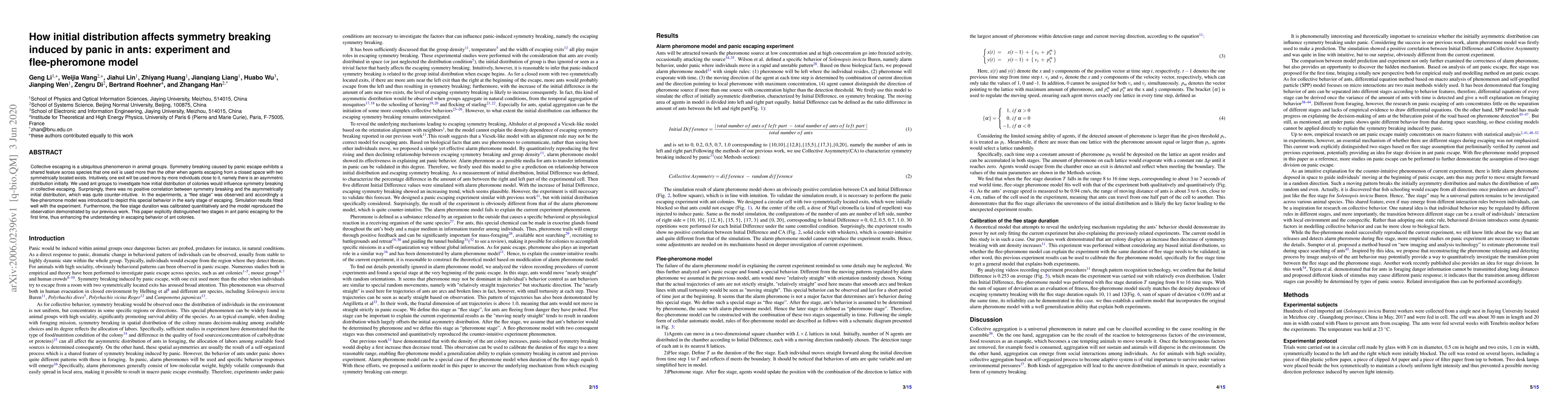 This paper investigates how initial distribution affects symmetry breaking in ant panic escape, revealing no positive correlation between initial asymmetry and escape behavior. A flee-pheromone model was developed to explain the observed flee stage, with simulation results matching experimental results, thus distinguishing two stages in ant panic behavior.