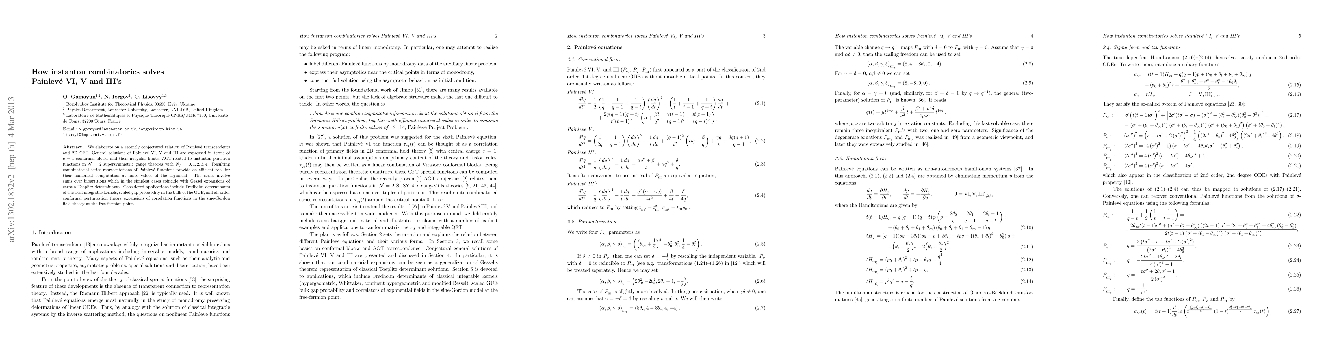 This paper connects Painlevé VI, V, and III transcendents to 2D conformal field theories (CFT) via $c=1$ conformal blocks, linking their solutions to instanton partition functions in $\mathcal{N}=2$ supersymmetric gauge theories. The resulting combinatorial series representations facilitate efficient numerical computation of these functions.