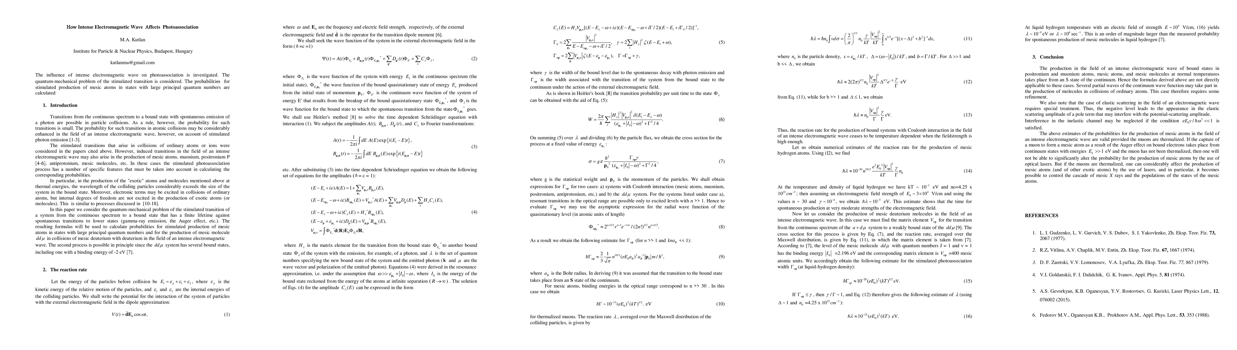 The influence of intense electromagnetic wave on photoassociation is investigated. The quantum-mechanical problem of the stimulated transition is considered. The probabilities for stimulated production of mesic atoms in states with large principal quantum numbers are calculated.