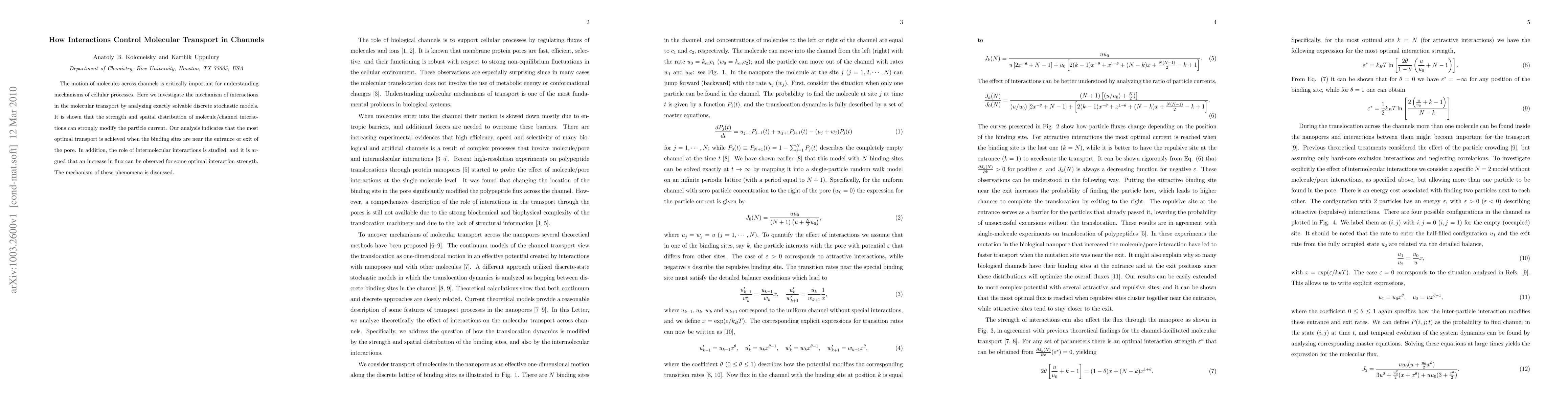 Research reveals that molecule/channel interactions can significantly affect molecular transport, with optimal transport occurring when binding sites are near the entrance or exit of the pore. Stronger interactions can even increase flux in some cases.