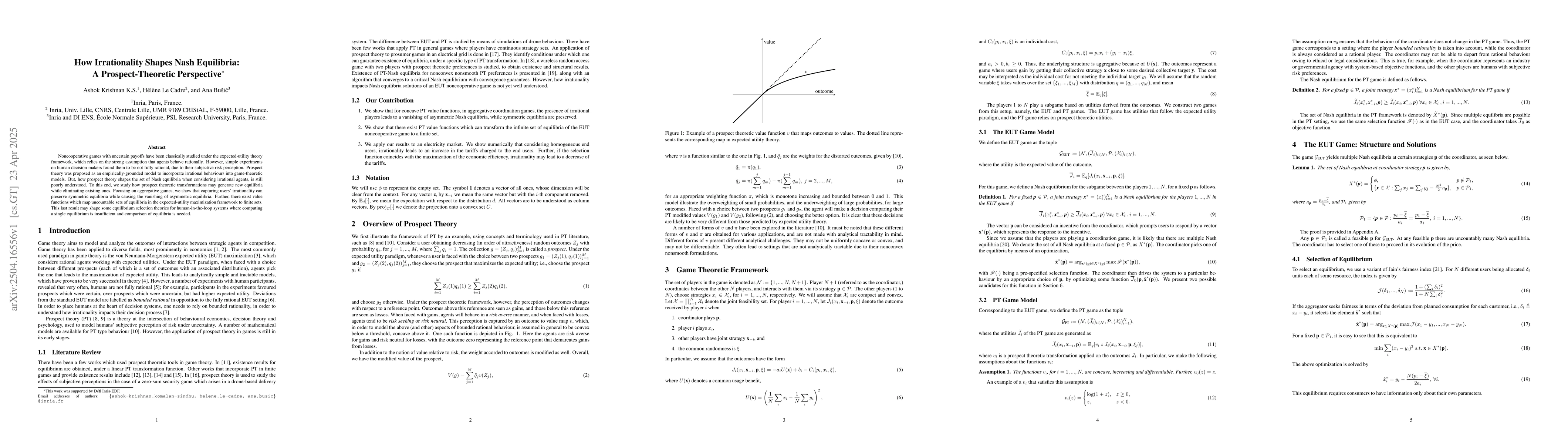 The work distinguishes itself by explicitly linking prospect theory to Nash equilibria in game theory, providing both theoretical insights and numerical simulations to illustrate the impact of irrationality on market equilibria.