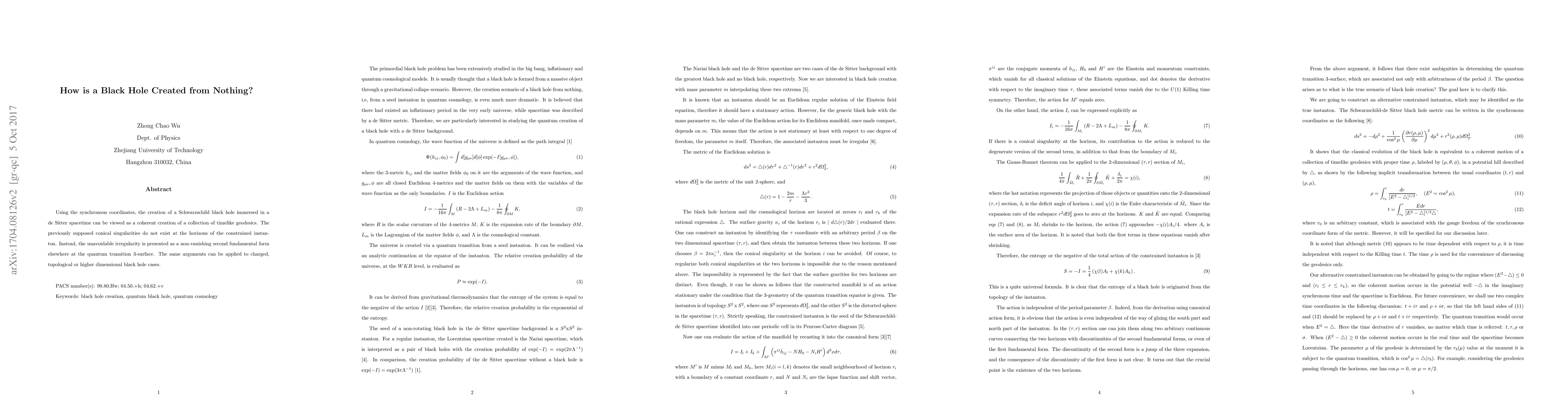 Using the synchronous coordinates, the creation of a Schwarzschild black hole immersed in a de Sitter spacetime can be viewed as a coherent creation of a collection of timelike geodesics. The previously supposed conical singularities do not exist at the horizons of the constrained instan- ton. Instead, the unavoidable irregularity is presented as a non-vanishing second fundamental form elsewhere at the quantum transition 3-surface. The same arguments can be applied to charged, topological or higher dimensional black hole cases.