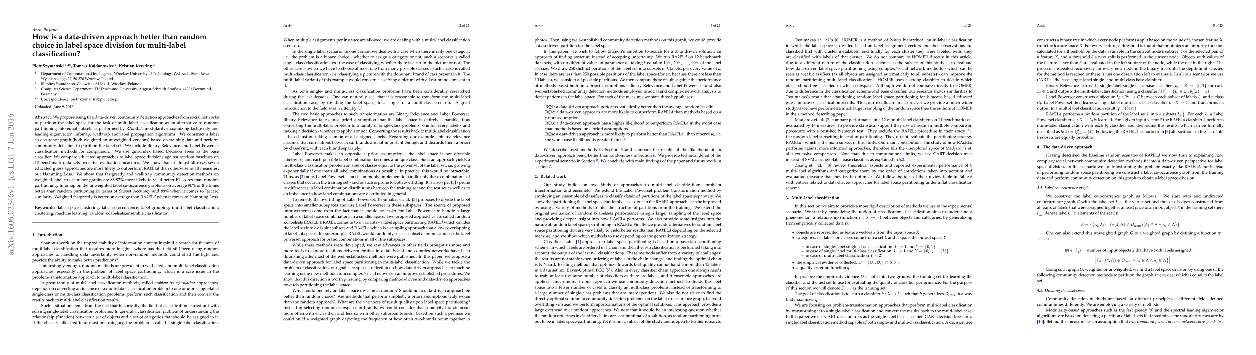 We propose using five data-driven community detection approaches from social networks to partition the label space for the task of multi-label classification as an alternative to random partitioning into equal subsets as performed by RAkELd: modularity-maximizing fastgreedy and leading eigenvector, infomap, walktrap and label propagation algorithms. We construct a label co-occurence graph (both weighted an unweighted versions) based on training data and perform community detection to partition the label set. We include Binary Relevance and Label Powerset classification methods for comparison. We use gini-index based Decision Trees as the base classifier. We compare educated approaches to label space divisions against random baselines on 12 benchmark data sets over five evaluation measures. We show that in almost all cases seven educated guess approaches are more likely to outperform RAkELd than otherwise in all measures, but Hamming Loss. We show that fastgreedy and walktrap community detection methods on weighted label co-occurence graphs are 85-92% more likely to yield better F1 scores than random partitioning. Infomap on the unweighted label co-occurence graphs is on average 90% of the times better than random paritioning in terms of Subset Accuracy and 89% when it comes to Jaccard similarity. Weighted fastgreedy is better on average than RAkELd when it comes to Hamming Loss.