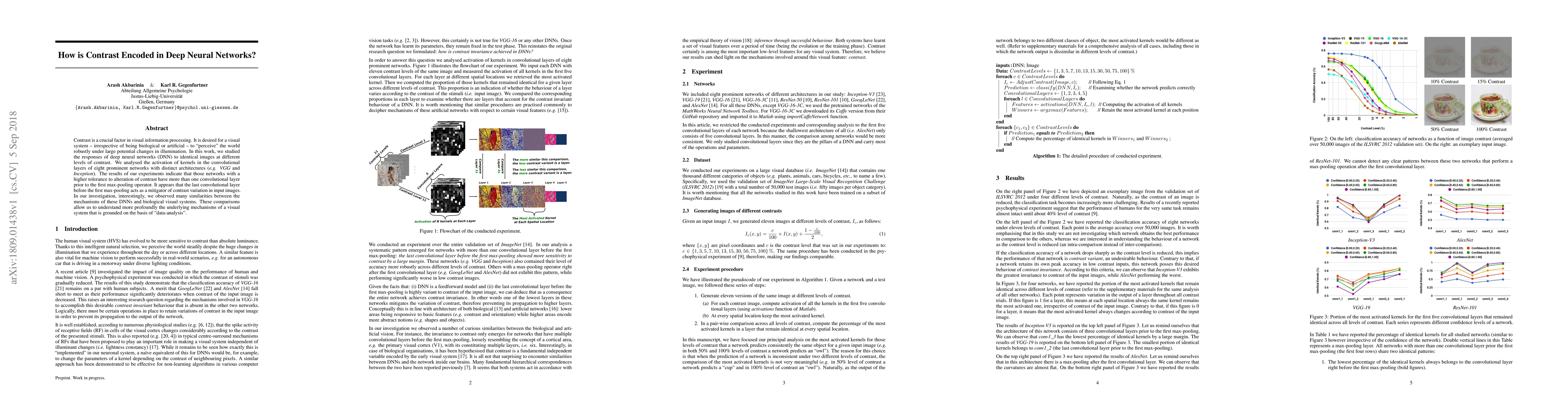 Contrast is a crucial factor in visual information processing. It is desired for a visual system - irrespective of being biological or artificial - to "perceive" the world robustly under large potential changes in illumination. In this work, we studied the responses of deep neural networks (DNN) to identical images at different levels of contrast. We analysed the activation of kernels in the convolutional layers of eight prominent networks with distinct architectures (e.g. VGG and Inception). The results of our experiments indicate that those networks with a higher tolerance to alteration of contrast have more than one convolutional layer prior to the first max-pooling operator. It appears that the last convolutional layer before the first max-pooling acts as a mitigator of contrast variation in input images. In our investigation, interestingly, we observed many similarities between the mechanisms of these DNNs and biological visual systems. These comparisons allow us to understand more profoundly the underlying mechanisms of a visual system that is grounded on the basis of "data-analysis".