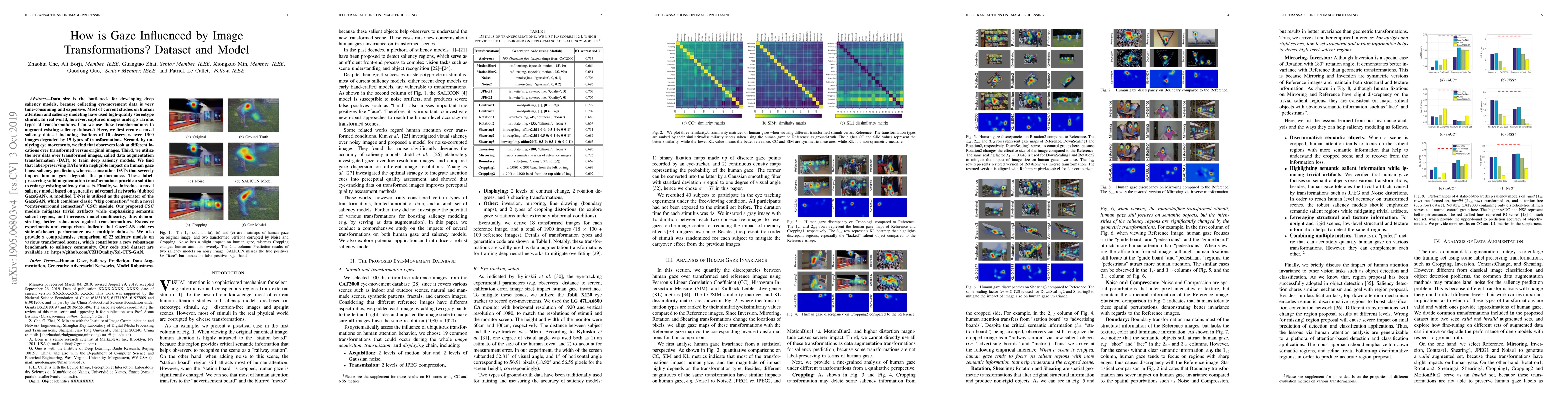 Researchers created a new saliency dataset by applying 19 image transformations to 1900 images and found that these transformations can be used to augment existing datasets without affecting human gaze, leading to improved saliency models like GazeGAN.