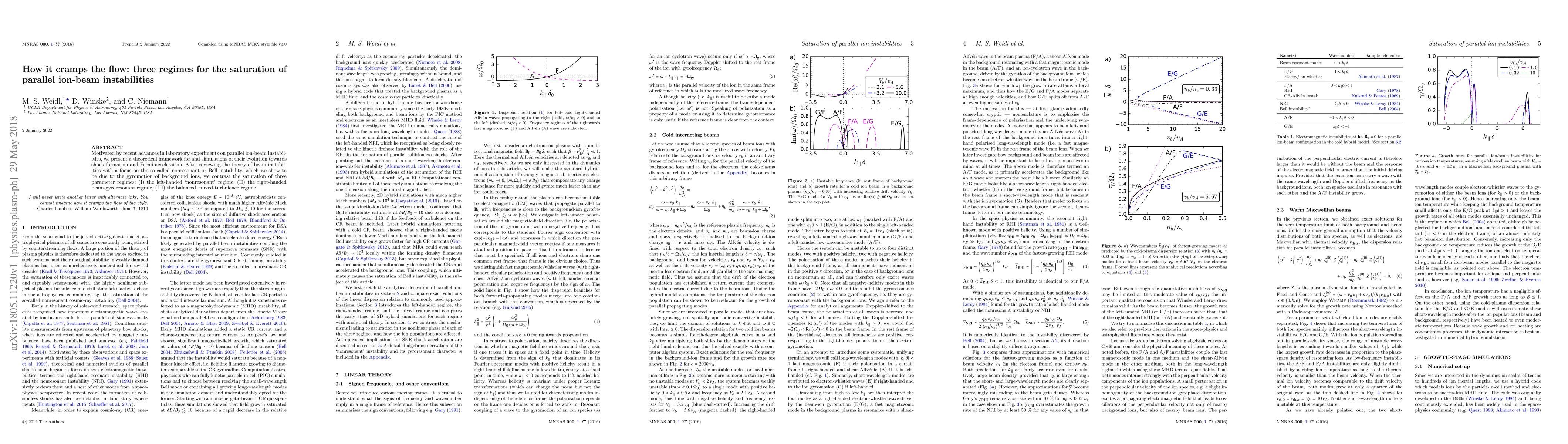 Motivated by recent advances in laboratory experiments on parallel ion-beam instabilities, we present a theoretical framework for and simulations of their evolution towards shock formation and Fermi acceleration. After reviewing the theory of beam instabilities with a focus on the so-called nonresonant or Bell instability, which we show to be due to the gyromotion of background ions, we contrast the saturation of three parameter regimes: (I) the left-handed "nonresonant" regime, (II) the right-handed beam-gyroresonant regime, (III) the balanced, mixed-turbulence regime.