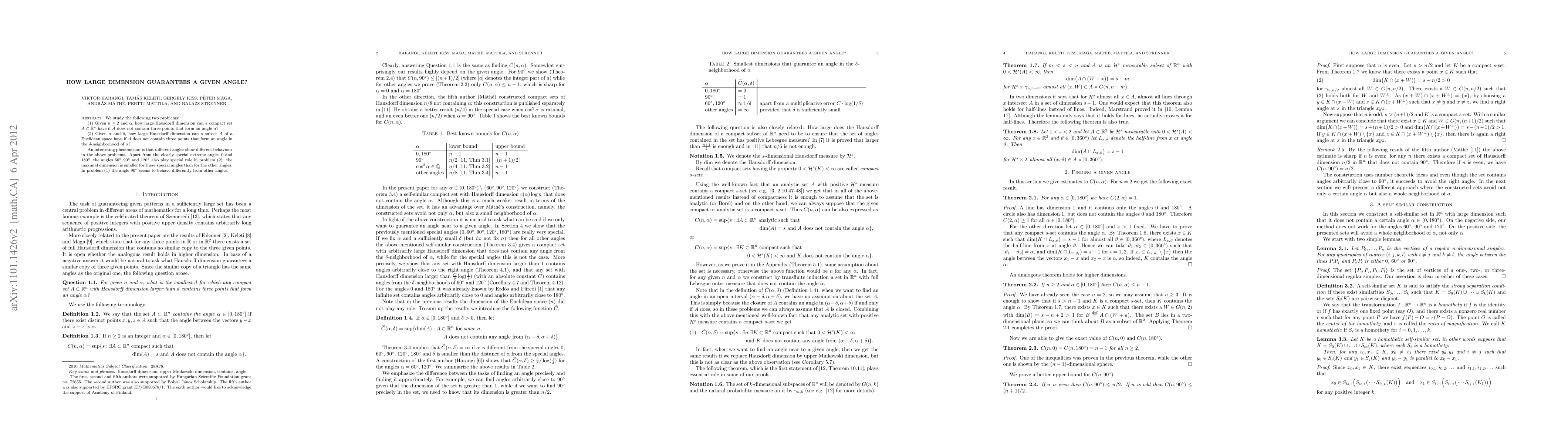 We study the following two problems: (1) Given $n\ge 2$ and $\al$, how large Hausdorff dimension can a compact set $A\su\Rn$ have if $A$ does not contain three points that form an angle $\al$? (2) Given $\al$ and $\de$, how large Hausdorff dimension can a %compact subset $A$ of a Euclidean space have if $A$ does not contain three points that form an angle in the $\de$-neighborhood of $\al$? An interesting phenomenon is that different angles show different behaviour in the above problems. Apart from the clearly special extreme angles 0 and $180^\circ$, the angles $60^\circ,90^\circ$ and $120^\circ$ also play special role in problem (2): the maximal dimension is smaller for these special angles than for the other angles. In problem (1) the angle $90^\circ$ seems to behave differently from other angles.