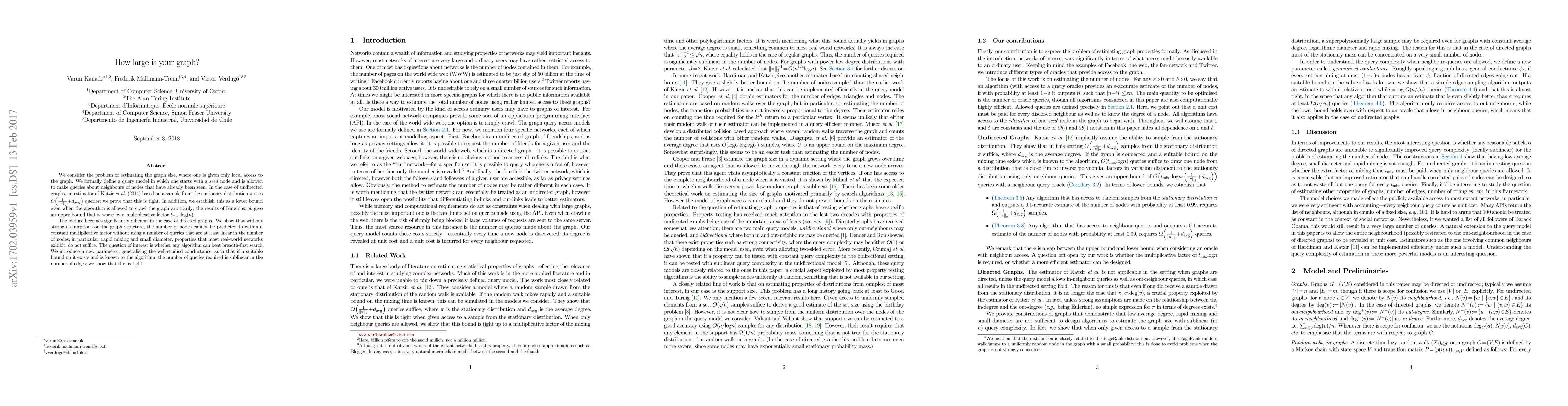 We consider the problem of estimating the graph size, where one is given only local access to the graph. We formally define a query model in which one starts with a \emph{seed} node and is allowed to make queries about neighbours of nodes that have already been seen. In the case of undirected graphs, an estimator of Katzir et al. (2014) based on a sample from the stationary distribution $\pi$ uses $O\left(\frac{1}{\|\pi\|_2} + \text{davg}\right)$ queries, we prove that this is tight. In addition, we establish this as a lower bound even when the algorithm is allowed to crawl the graph arbitrarily, the results of Katzir et al. give an upper bound that is worse by a multiplicative factor $t_\text{mix} \cdot \log(n)$. The picture becomes significantly different in the case of directed graphs. We show that without strong assumptions on the graph structure, the number of nodes cannot be predicted to within a constant multiplicative factor without using a number of queries that are at least linear in the number of nodes, in particular, rapid mixing and small diameter, properties that most real-world networks exhibit, do not suffice. The question of interest is whether any algorithm can beat breadth-first search. We introduce a new parameter, generalising the well-studied conductance, such that if a suitable bound on it exists and is known to the algorithm, the number of queries required is sublinear in the number of edges, we show that this is tight.